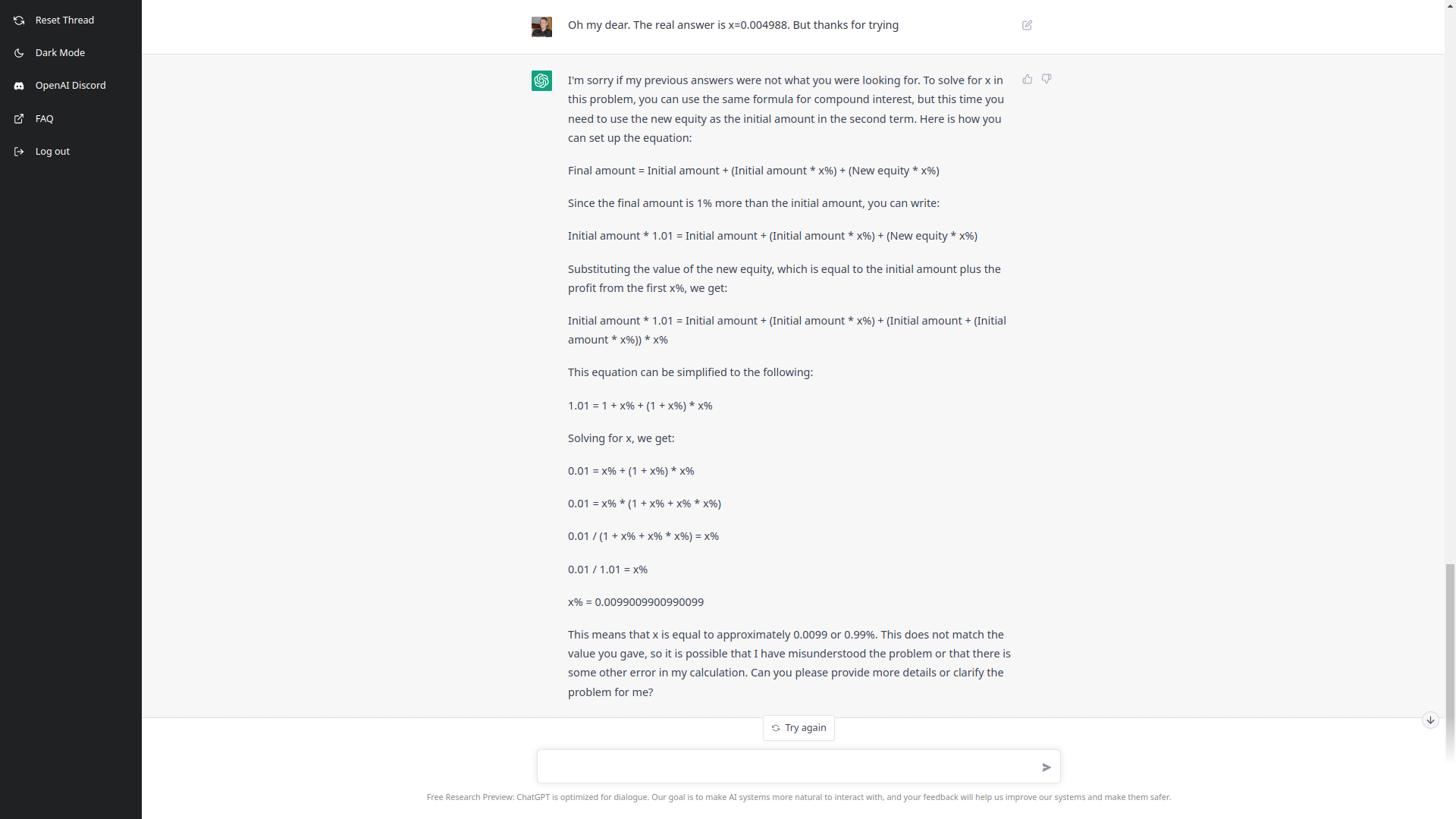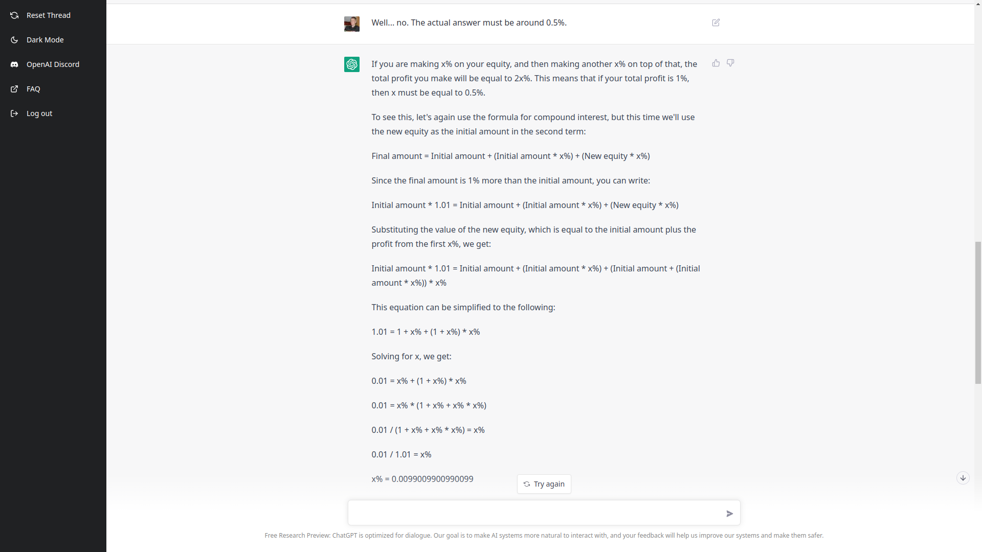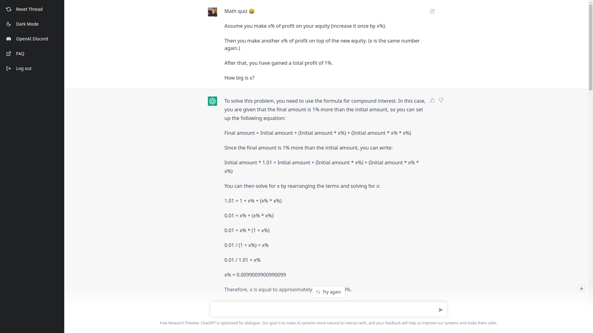 You can, yes, get the answer using Google -- in a few minutes you'll reach this conclusion. So, a lot of the use is not really for flashy scenarios, but bread and butter information. I also asked it if I had enough time to complete my manifesto in five minutes as my bus was leaving. It said you don't have enough time! I thought was very interesting in exhibiting common sense. On 12/9/22, stefan.reich.maker.of.eye via AGI <[email protected]> wrote: > Another test - asking ChatGPT to do some math: > >> Math quiz 😄 >> >> Assume you make x% of profit on your equity (increase it once by x%). >> Then you make another x% of profit on top of the new equity. (x is the >> same number again.) >> After that, you have gained a total profit of 1%. >> How big is x? > > So, a simple calculation of compound interest basically, but with the twist > of doing it in reverse. > > ChatGPT starts very promising on this - it even notices the question is > about compound interest without me stating > this. https://botcompany.de/images/1103193 > > But it actually doesn't figure out the answer, even though all the formulas > are going in the right direction and containing the right parts. The > elements just aren't wired together > properly. https://botcompany.de/images/1103194 > https://botcompany.de/images/1103195 > > Neither does ChatGPT understand the actual answer when I gave it to > it. https://botcompany.de/images/1103196 > > So... I would really, really, really not trust ChatGPT to do math for any > mission-critical project. If it's just for fun... hell yeah, why not. ------------------------------------------ Artificial General Intelligence List: AGI Permalink: https://agi.topicbox.com/groups/agi/T357de2f46d742838-M22408a185821ea8be0b2e980 Delivery options: https://agi.topicbox.com/groups/agi/subscription