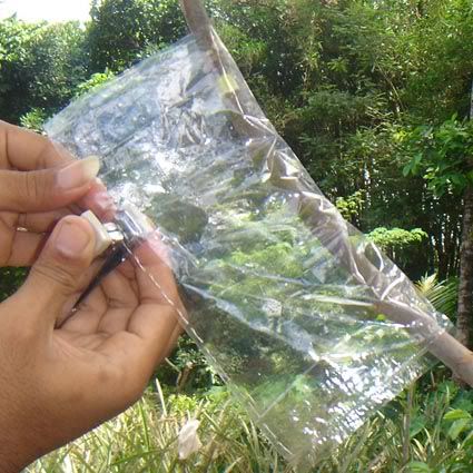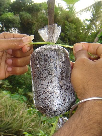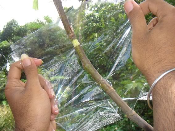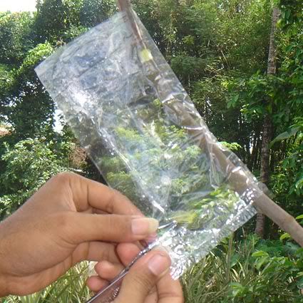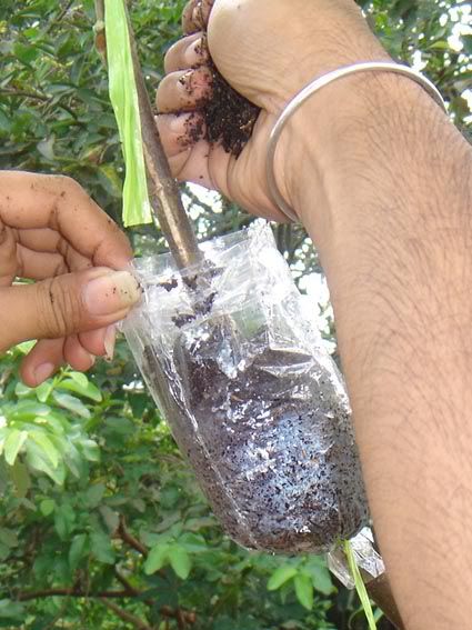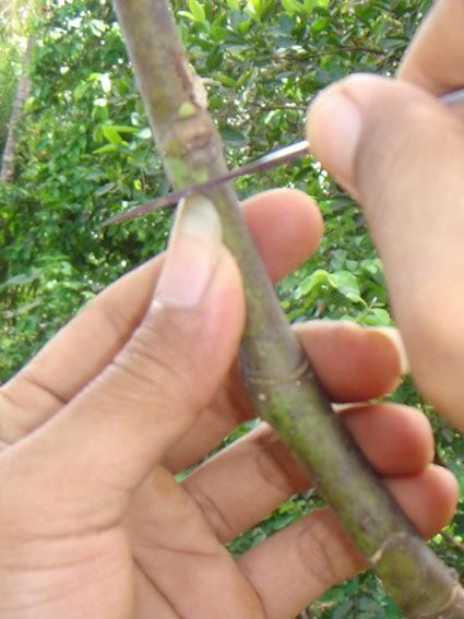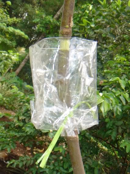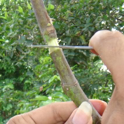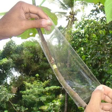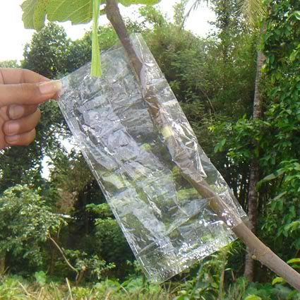 Salam sukses Saya mau berbagi pengalaman soal cara mencangkok pada tanaman. Masalah yang sering timbul adalan susahnya mencari media cangkok yang bisa dikepal, misalnya akar andam / spaghnum moss / lumut. Jika di sekitar kita hanya ada tanah / apalagi sedikit berpasir maka cukup merepotkan bagi kita untuk mengepal media di batang yang akan dicangkok sebelum dibungkus dengan plastik / sabut kelapa / kain. Dari hasil renungan dan uji coba, saya telah menemukan teknik sederhana yang bisa diterapkan pada penggunaan media cangkok apapun, bahkan pasir !!!! Keuntungan lain adalah kita bisa membuat ukuran cangkok sebesar yang kita inginkan, terutama jika kita mencangkok batang yang besar, maka dibutuhkan ukuran cangkok yang besar pula agar akar yang tumbuh cukup banyak, sehingga saat tanaman dipotong dan diadaptasikan tidak akan stress berat. Saya pernah mencangkok mangga dengan diameter batang 10 cm, ukuran cangkok juga tidak main-main, diameternya 20 cm dengan panjang sekitar 30 cm (pembungkus dari kain spanduk). Karena ukuran cangkok besar dan akar sangat banyak, maka saat dipindahkan tanaman relatif tidak stress. Ok..saya mulai saja: