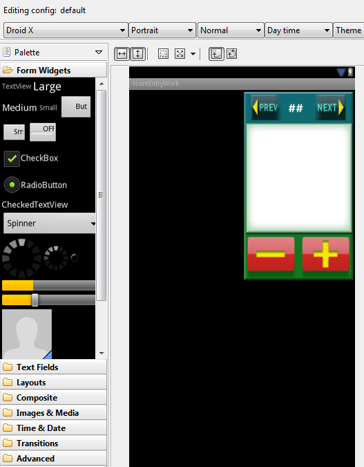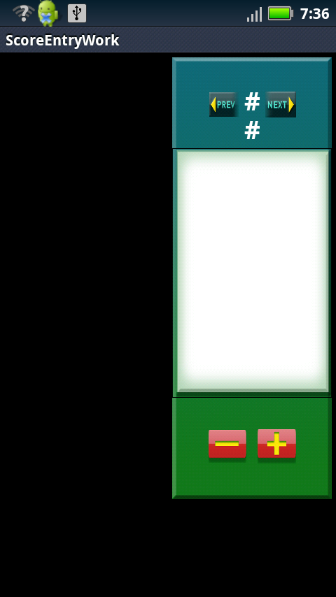 I am attempting to use some custom ImageButton widgets with custom graphics files as buttons. I simply want the buttons to fill the parent layouts they are in. In the designer, they look the way I think they should. But when I run it on a device, the buttons are way to small. Here is what the design looks like, using a device that is set up to emulate the Droid X that I am testing with. <http://pozzy.com/consulting/LayoutDesignInEclipse.PNG> <https://lh3.googleusercontent.com/-MiY8HoEMWMw/UASbZg-o53I/AAAAAAAAABg/-Zs-2TheI0w/s1600/LayoutDesignInEclipse.PNG> Here is a screen capture of the screen when running on my Droid X: <http://pozzy.com/consulting/ScoreEntryDroidXScreenCapture.png> <https://lh6.googleusercontent.com/-f1cf69z790Q/UASbhyu2dYI/AAAAAAAAABo/PchCfnoY8ps/s1600/ScoreEntryDroidXScreenCapture.png> I tried to trim the code down, but it still relies on a number of button image files. The full project is attached. Here is the layout XML: <?xml version="1.0" encoding="utf-8"?> <RelativeLayout xmlns:android="http://schemas.android.com/apk/res/android" android:layout_width="fill_parent" Android:layout_height="fill_parent"> <LinearLayout android:id="@+id/scoreEntryPlayersAndMainEntry" android:layout_width="fill_parent" android:layout_height="wrap_content" android:orientation="horizontal" > <LinearLayout android:id="@+id/scoreEntryPlayers" android:layout_width="0dp" android:layout_height="fill_parent" android:layout_weight=".5" android:orientation="vertical" android:paddingBottom="4dp" android:paddingTop="4dp" android:paddingLeft="4dp" > </LinearLayout> <LinearLayout android:id="@+id/scoreEntryMainEntry" android:layout_width="0dp" android:layout_height="fill_parent" android:layout_weight=".5" android:maxWidth="100dp" android:orientation="vertical" android:paddingBottom="4dp" android:paddingLeft="4dp" android:paddingRight="4dp" android:paddingTop="4dp" > <LinearLayout android:id="@+id/scoreEntryPreviousHoleNumberNextRow" android:orientation="horizontal" android:background="@drawable/score_entry_background_top" android:layout_width="fill_parent" android:layout_height="wrap_content" android:layout_weight=".1" android:gravity="center|top" > <ImageButton android:id="@+id/previousHoleButton" android:layout_width="0dp" android:layout_height="fill_parent" android:layout_weight="2" android:layout_margin="5dp" android:scaleType="fitCenter" android:background="@null" android:contentDescription="Previous Hole" android:src="@drawable/score_entry_prev" /> <TextView android:id="@+id/holeNumber" android:layout_width="0dp" android:layout_height="match_parent" android:layout_weight="1" android:background="@null" android:paddingTop="20dp" android:text="##" android:textColor="#FFFFFF" android:textSize="24sp" android:textStyle="bold" /> <ImageButton android:id="@+id/nextHoleButton" android:layout_width="0dp" android:layout_height="fill_parent" android:layout_weight="2" android:layout_margin="5dp" android:scaleType="fitCenter" android:background="@null" android:contentDescription="Next Hole" android:src="@drawable/score_entry_next" /> </LinearLayout> <LinearLayout android:id="@+id/scoreEntryCurrentScore" android:background="@drawable/score_entry_background_middle" android:layout_width="fill_parent" android:layout_height="wrap_content" android:layout_weight=".8" > <FrameLayout android:id="@+id/scoreEntryScoreOverlays" android:layout_width="fill_parent" android:layout_height="wrap_content" > <LinearLayout android:visibility="invisible" android:id="@+id/scoreEntryPlayerScoreLayout" android:layout_width="fill_parent" android:layout_height="wrap_content" android:orientation="vertical" > <TextView android:id="@+id/currentPlayer" android:layout_width="fill_parent" android:layout_height="wrap_content" android:layout_margin="10dp" android:gravity="center" android:text="Player Name" android:textColor="#aaaaaa" android:textSize="16sp" android:textStyle="italic" /> <TextView android:id="@+id/currentScore" android:layout_width="fill_parent" android:layout_height="fill_parent" android:text="99" android:gravity="center" android:layout_gravity="bottom" android:textColor="#ff0000" android:textSize="100sp" android:textStyle="bold|italic" /> </LinearLayout> </FrameLayout> </LinearLayout> <LinearLayout android:id="@+id/scoreEntryScoreDownUpRow" android:layout_width="fill_parent" android:layout_height="wrap_content" android:background="@drawable/score_entry_background_bottom" android:gravity="bottom" android:layout_weight=".1" android:orientation="horizontal" > <ImageButton android:id="@+id/scoreDownButton" android:layout_width="0dp" android:layout_height="fill_parent" android:layout_margin="5dp" android:layout_weight="1" android:background="@null" android:scaleType="fitCenter" android:src="@drawable/score_entry_minus" /> <ImageButton android:id="@+id/scoreUpButton" android:layout_width="0dp" android:layout_height="fill_parent" android:layout_margin="5dp" android:layout_weight="1" android:background="@null" android:scaleType="fitCenter" android:src="@drawable/score_entry_plus" /> </LinearLayout> </LinearLayout> </LinearLayout> </RelativeLayout> Any help in figuring out how to get the buttons filling their respective areas would be greatly appreciated! -- You received this message because you are subscribed to the Google Groups "Android Developers" group. To post to this group, send email to [email protected] To unsubscribe from this group, send email to [email protected] For more options, visit this group at http://groups.google.com/group/android-developers?hl=en