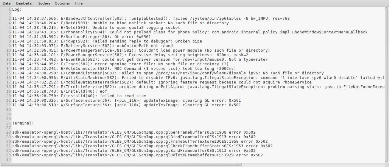 Hi, I recently updated my Lubuntu 11.4 Version to 11.10. I also added some Resolutions in the xorg.conf file. I think it has something to do with the problem I have. Before the update, I had no problems starting the emulator. Now it's only possible with GPU enabled. But than the emulator-screen becomes all white an stays white. If I start an Emulator from the terminal, the terminal gives some Errormessages which I posted together with some Logs in the image, I hope it's enough information.