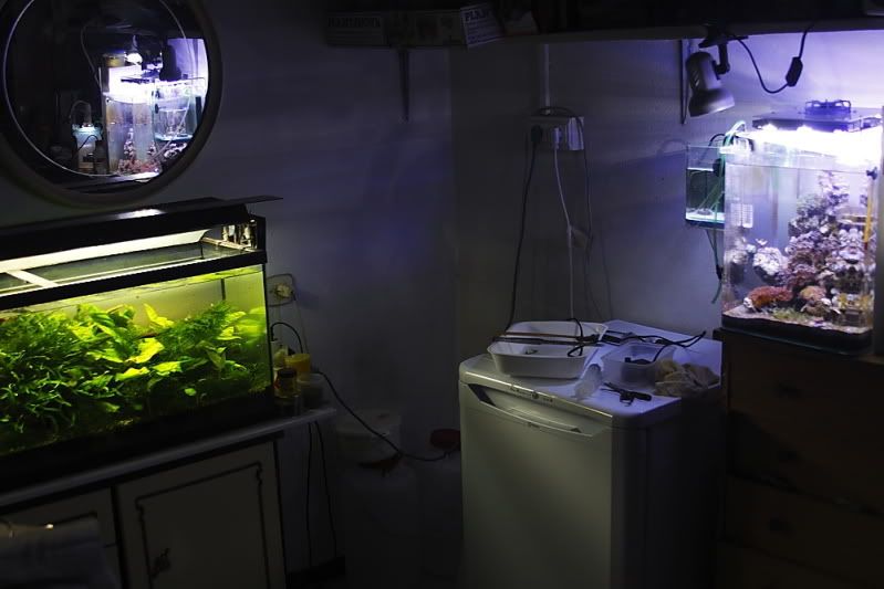 Os dejo una imagen del acuario de arrecife iluminado con 24w de leds frente a mi acuario de plantas iluminado con 102w, 2 pl de 36w y un tubo de 30w.
