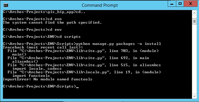I run ElasticSearch successfully, but once I tried to create my database, the first problem pop up... there is no "manage.py" in ENV folder, but in ENV\Scripts I typed the secuence "python manage.py packages -o install" and the result was: "no module named functools" (u can see it in the following screeshot) <https://lh3.googleusercontent.com/-6SlePPGZADk/VZ7DCF4FqSI/AAAAAAAAA2k/CFMkYlS01m0/s1600/Capture.JPG> My first question is> why manage.py is not in ENV folder? and, is this missing "functools" an ARCHES or Python problem?. The same problem happens when runserver action is commanded to manage.py , which I think is the main step in order to run Arches-HIP :( Of course, after missing that, no browser windows is displaying nothing at localhost:8000 Thank you very much for your help!! Jorge -- -- To post, send email to [email protected]. To unsubscribe, send email to [email protected]. For more information, visit https://groups.google.com/d/forum/archesproject?hl=en --- You received this message because you are subscribed to the Google Groups "Arches Project" group. To unsubscribe from this group and stop receiving emails from it, send an email to [email protected]. For more options, visit https://groups.google.com/d/optout.