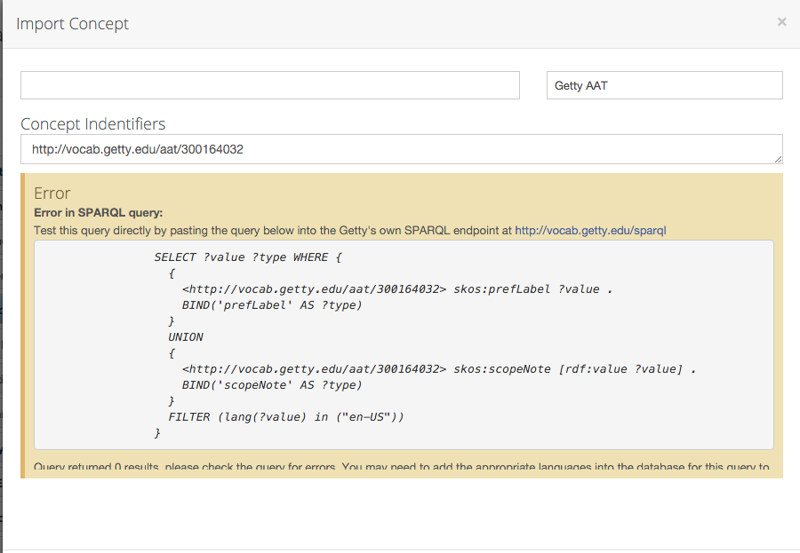 Hi Angela, I looked into this issue and there are a couple of things that are preventing you from importing the AAT value for "stovewood construction" ( http://vocab.getty.edu/aat/300164032). If you notice, the raw query includes a FILTER for language. By looking at your query I can see that you have only one language defined (en-US). If you remove the FILTER portion of the query and run it directly from the link provided you'll see that the AAT provides this concept in 4 languages (en-us, en, nl, es).