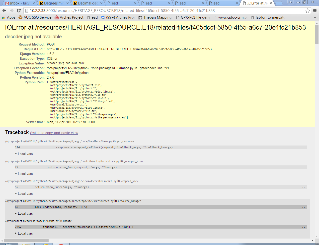 1. I tried uploading a JPEG image in the resource input screen, (and in edit mode) and got this error: "decoder JPEG not available", when saving to the database. 2. I also tried uploading a PNG image and got a different error: a Value error: "wrong number of lut entries", when saving to the database. 3. I also tried using the Information Resource input to upload a file and immediately got an error when simply selecting the 'file upload' button after putting in some details on the resource summary screen. When I went directly to the 'upload file' button, (without putting in details I was able to upload an image but then got the same 'decoder JPEG not available' error when trying to save. (I think this error has already been reported) I've added the error reports here. <https://lh3.googleusercontent.com/-5L_07_WMNu0/Vwt8VuuPfRI/AAAAAAAAACE/O6spd7c5vT4uA4dnsopDFUlCicG_MZ3Jg/s1600/JPEGUploadError.PNG> <https://lh3.googleusercontent.com/-OENOtBfpV2k/Vwt8beURdLI/AAAAAAAAACI/wiZKbYDPWiAUlM-PPeCRzBi8W1PKYUH2g/s1600/PNGUploadError.PNG> <https://lh3.googleusercontent.com/-CWiPxXhXdUE/Vwt8lluXhGI/AAAAAAAAACM/dKqmPR606Z8_BQr227Mdqfj5TsWx8Nc2g/s1600/InfoResourceError.PNG> Any help appreciated, thank you. Lucy -- -- To post, send email to [email protected]. To unsubscribe, send email to [email protected]. For more information, visit https://groups.google.com/d/forum/archesproject?hl=en --- You received this message because you are subscribed to the Google Groups "Arches Project" group. To unsubscribe from this group and stop receiving emails from it, send an email to [email protected]. For more options, visit https://groups.google.com/d/optout.