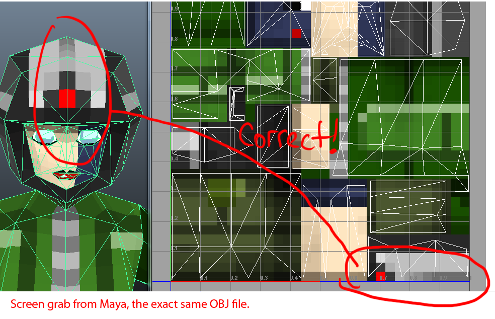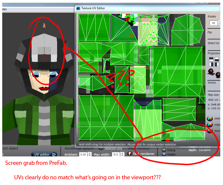 The UV placement in Prefab (and thus Away3D) do not correctly represent on the model. See the following images: UVs and texture on the model are not the same - http://i737.photobucket.com/albums/xx11/mrmmaclean/random/UVsWTF.png Same OBJ in Maya to show correctly - http://i737.photobucket.com/albums/xx11/mrmmaclean/random/UVsWTFb.png It is quite obvious by the Prefab screenshot that the texture is not displayed as the Prefab UV Editor indicates. I have tried a number of file types with the same results. Clearly something is up with how Away3D renders the texture space. Any insight to why this is? Thanks! -Micheal