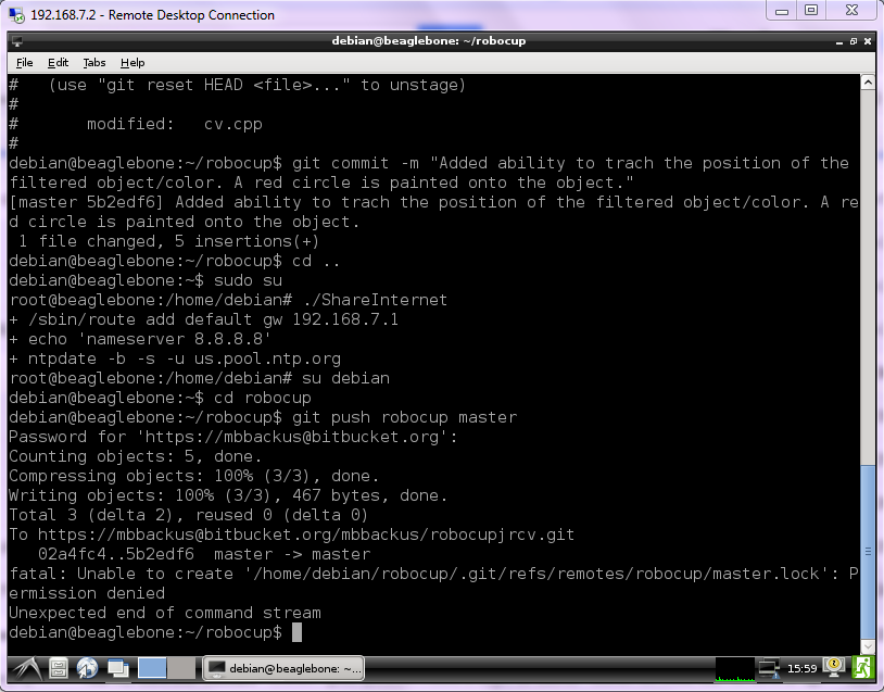 I'm still running into some annoying root/debian user permissions problems. First, I have to switch to the root user in order to run a script I wrote to share the host computer's Internet connection. Second, when I push to git I get an error message about permission denied. The push goes through okay, but I don't know how to go about fixing whatever is causing the error.
