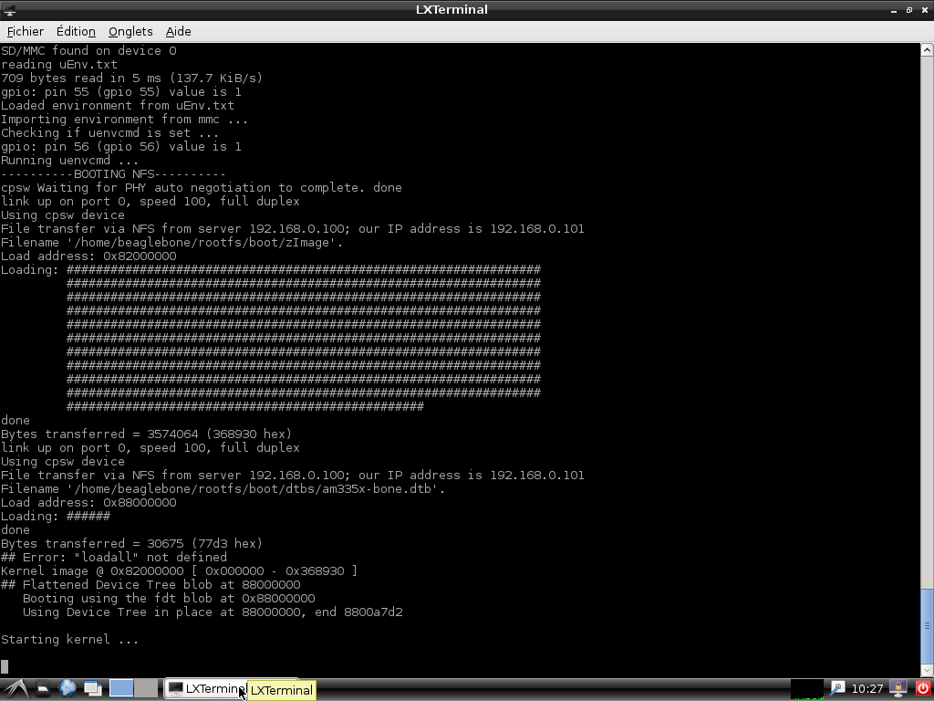 Here is my uEnv.txt file : *http://textuploader.com/xodk <http://textuploader.com/xodk>* The Beaglebone Black (192.168.0.101) apparently boot properly from the server (192.168.0.100) : *http://nsm08.casimages.com/img/2015/03/21/15032110305417342013089867.png <http://nsm08.casimages.com/img/2015/03/21/15032110305417342013089867.png>* But when the kernel has started, the loading stop at the final line : *http://nsm08.casimages.com/img/2015/03/21/15032110350117342013089870.png <http://nsm08.casimages.com/img/2015/03/21/15032110350117342013089870.png>* I don't understand why the kernel loading stopped at the line *mmc supply vmmc_aux not found, using dummy regulator*. Do you think that I forgot arguments in uEnv.txt or is it possible that the kernel loaded is obsolete ? Thank you for your help, J.G. -- For more options, visit http://beagleboard.org/discuss --- You received this message because you are subscribed to the Google Groups "BeagleBoard" group. To unsubscribe from this group and stop receiving emails from it, send an email to [email protected]. For more options, visit https://groups.google.com/d/optout.