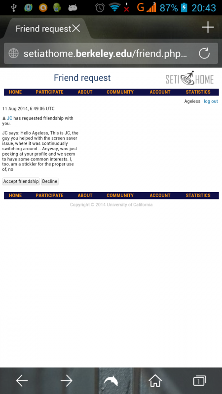 I ask as I got a friends request on Seti, where the message was abruptly cut off, so now I wonder what else the person wrote. Luckily I allowed the friends request from my phone, and then back-buttoned so I could make a screen shot of what that said. Please see http://img.photobucket.com/albums/v289/Ageless/BOINC/friendsrequest.png So can we get a warning of the amount of characters one is allowed to use in this window and a count down of how many are still allowed when typing the message , just as we have it on the signature window in the forum preferences? With thanks, -- Jord van der Elst. _______________________________________________ boinc_dev mailing list [email protected] http://lists.ssl.berkeley.edu/mailman/listinfo/boinc_dev To unsubscribe, visit the above URL and (near bottom of page) enter your email address.