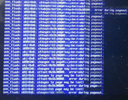 uvn_flush: WARNING; changes to page may be lost! uvn_flush: obj=0x0, offset=0x5b30000. error during pageout. I had to take a picture to be able to decipher this, as it was scrolling too fast to read otherwise. See [1] - there you can also see that there was one other line that was logged, this came by a couple of times but not as often as the two I copied above. After a reboot, the system then spends quite some time during fsck and then the relinking of libraries (storage is SLOW on this machine). No problems during this time. Also in single user mode this doesn't happen. I have a few seconds to ssh in and grab a dmesg before it locks me out again. And then it is too busy scrolling the above to respond to anything - only recourse is powering the box down. On a whim, I disabled KARL, figuring that's the one "big" thing that starts after reboot that may cause this. And indeed, nothing happens without it running. Manually starting KARL (`make newbsd` in the correct location) results in the same output after a little bit of runtime. Downgrading to 6.7 (what it was previously running) works fine, including kernel relinking at boot. dmesg from both the latest snapshot and 6.7 included below. Any idea what may be going wrong here? Next step is for me to try to find the breaking snapshot by trying the archive at hostserver. Paul 'WEiRD' de Weerd [1]: http://www.weirdnet.nl/ff/20200609_uvn_flush.jpg --- 6.7 dmesg -------------------------------------------------------- OpenBSD 6.7 (GENERIC.MP) #182: Thu May 7 11:11:58 MDT 2020 [email protected]:/usr/src/sys/arch/amd64/compile/GENERIC.MP real mem = 4182315008 (3988MB) avail mem = 4042940416 (3855MB) mpath0 at root scsibus0 at mpath0: 256 targets mainbus0 at root bios0 at mainbus0: SMBIOS rev. 3.0 @ 0x7b8de000 (51 entries) bios0: vendor American Megatrends Inc. version "5.11" date 12/23/2016 bios0: Default string Default string acpi0 at bios0: ACPI 5.0 acpi0: sleep states S0 S4 S5 acpi0: tables DSDT FACP APIC FPDT FIDT MCFG SSDT SSDT SSDT UEFI SSDT HPET SSDT SSDT SSDT LPIT BCFG PRAM TPM2 CSRT WDAT SSDT SSDT SSDT acpi0: wakeup devices acpitimer0 at acpi0: 3579545 Hz, 24 bits acpimadt0 at acpi0 addr 0xfee00000: PC-AT compat cpu0 at mainbus0: apid 0 (boot processor) cpu0: Intel(R) Atom(TM) x7-Z8700 CPU @ 1.60GHz, 1600.30 MHz, 06-4c-03 cpu0: FPU,VME,DE,PSE,TSC,MSR,PAE,MCE,CX8,APIC,SEP,MTRR,PGE,MCA,CMOV,PAT,PSE36,CFLUSH,DS,ACPI,MMX,FXSR,SSE,SSE2,SS,HTT,TM,PBE,SSE3,PCLMUL,DTES64,MWAIT,DS-CPL,VMX,EST,TM2,SSSE3,CX16,xTPR,PDCM,SSE4.1,SSE4.2,MOVBE,POPCNT,DEADLINE,AES,RDRAND,NXE,RDTSCP,LONG,LAHF,3DNOWP,PERF,ITSC,TSC_ADJUST,SMEP,ERMS,MD_CLEAR,IBRS,IBPB,STIBP,SENSOR,ARAT,MELTDOWN cpu0: 1MB 64b/line 16-way L2 cache cpu0: smt 0, core 0, package 0 mtrr: Pentium Pro MTRR support, 8 var ranges, 88 fixed ranges cpu0: apic clock running at 79MHz cpu0: mwait min=64, max=64, C-substates=0.2.0.0.0.0.3.3, IBE cpu1 at mainbus0: apid 2 (application processor) cpu1: Intel(R) Atom(TM) x7-Z8700 CPU @ 1.60GHz, 1599.96 MHz, 06-4c-03 cpu1: FPU,VME,DE,PSE,TSC,MSR,PAE,MCE,CX8,APIC,SEP,MTRR,PGE,MCA,CMOV,PAT,PSE36,CFLUSH,DS,ACPI,MMX,FXSR,SSE,SSE2,SS,HTT,TM,PBE,SSE3,PCLMUL,DTES64,MWAIT,DS-CPL,VMX,EST,TM2,SSSE3,CX16,xTPR,PDCM,SSE4.1,SSE4.2,MOVBE,POPCNT,DEADLINE,AES,RDRAND,NXE,RDTSCP,LONG,LAHF,3DNOWP,PERF,ITSC,TSC_ADJUST,SMEP,ERMS,MD_CLEAR,IBRS,IBPB,STIBP,SENSOR,ARAT,MELTDOWN cpu1: 1MB 64b/line 16-way L2 cache cpu1: smt 0, core 1, package 0 cpu2 at mainbus0: apid 4 (application processor) cpu2: Intel(R) Atom(TM) x7-Z8700 CPU @ 1.60GHz, 1599.98 MHz, 06-4c-03 cpu2: FPU,VME,DE,PSE,TSC,MSR,PAE,MCE,CX8,APIC,SEP,MTRR,PGE,MCA,CMOV,PAT,PSE36,CFLUSH,DS,ACPI,MMX,FXSR,SSE,SSE2,SS,HTT,TM,PBE,SSE3,PCLMUL,DTES64,MWAIT,DS-CPL,VMX,EST,TM2,SSSE3,CX16,xTPR,PDCM,SSE4.1,SSE4.2,MOVBE,POPCNT,DEADLINE,AES,RDRAND,NXE,RDTSCP,LONG,LAHF,3DNOWP,PERF,ITSC,TSC_ADJUST,SMEP,ERMS,MD_CLEAR,IBRS,IBPB,STIBP,SENSOR,ARAT,MELTDOWN cpu2: 1MB 64b/line 16-way L2 cache cpu2: smt 0, core 2, package 0 cpu3 at mainbus0: apid 6 (application processor) cpu3: Intel(R) Atom(TM) x7-Z8700 CPU @ 1.60GHz, 1599.97 MHz, 06-4c-03 cpu3: FPU,VME,DE,PSE,TSC,MSR,PAE,MCE,CX8,APIC,SEP,MTRR,PGE,MCA,CMOV,PAT,PSE36,CFLUSH,DS,ACPI,MMX,FXSR,SSE,SSE2,SS,HTT,TM,PBE,SSE3,PCLMUL,DTES64,MWAIT,DS-CPL,VMX,EST,TM2,SSSE3,CX16,xTPR,PDCM,SSE4.1,SSE4.2,MOVBE,POPCNT,DEADLINE,AES,RDRAND,NXE,RDTSCP,LONG,LAHF,3DNOWP,PERF,ITSC,TSC_ADJUST,SMEP,ERMS,MD_CLEAR,IBRS,IBPB,STIBP,SENSOR,ARAT,MELTDOWN cpu3: 1MB 64b/line 16-way L2 cache cpu3: smt 0, core 3, package 0 ioapic0 at mainbus0: apid 1 pa 0xfec00000, version 20, 115 pins acpimcfg0 at acpi0 acpimcfg0: addr 0xe0000000, bus 0-255 acpihpet0 at acpi0: 14318179 Hz acpiprt0 at acpi0: bus 0 (PCI0) acpiprt1 at acpi0: bus 1 (RP01) acpiprt2 at acpi0: bus -1 (RP02) acpiprt3 at acpi0: bus -1 (RP03) acpiprt4 at acpi0: bus -1 (RP04) acpicpu0 at acpi0: C3(10@1000 mwait.1@0x64), C2(10@500 mwait.1@0x58), C1(1000@1 mwait.1), PSS acpicpu1 at acpi0: C3(10@1000 mwait.1@0x64), C2(10@500 mwait.1@0x58), C1(1000@1 mwait.1), PSS acpicpu2 at acpi0: C3(10@1000 mwait.1@0x64), C2(10@500 mwait.1@0x58), C1(1000@1 mwait.1), PSS acpicpu3 at acpi0: C3(10@1000 mwait.1@0x64), C2(10@500 mwait.1@0x58), C1(1000@1 mwait.1), PSS acpipwrres0 at acpi0: ID3C, resource for ISP3 acpipwrres1 at acpi0: WWPR, resource for HS03, MDM1 acpipwrres2 at acpi0: WWPR, resource for HS13, MDM1 acpipwrres3 at acpi0: WWPR, resource for SSC1, MDM3 acpipwrres4 at acpi0: WWPR, resource for SSCW, MDM3 acpipwrres5 at acpi0: WWPR, resource for HSC1, MDM2 acpipwrres6 at acpi0: WWPR, resource for HSC3, MDM4 acpipwrres7 at acpi0: CLK3, resource for RTK1, RTKA acpipwrres8 at acpi0: CLK4 acpipwrres9 at acpi0: CLK2, resource for NFC2 acpipwrres10 at acpi0: CLK1 acpipwrres11 at acpi0: CLK0, resource for CA10, CAM9, CAM3 acpipwrres12 at acpi0: CLK1, resource for CAM4 acpipwrres13 at acpi0: USBC, resource for XHC1, OTG1 acpipwrres14 at acpi0: P28X acpipwrres15 at acpi0: P18X acpipwrres16 at acpi0: P12X acpipwrres17 at acpi0: P28P acpipwrres18 at acpi0: P18P acpipwrres19 at acpi0: P19X acpipwrres20