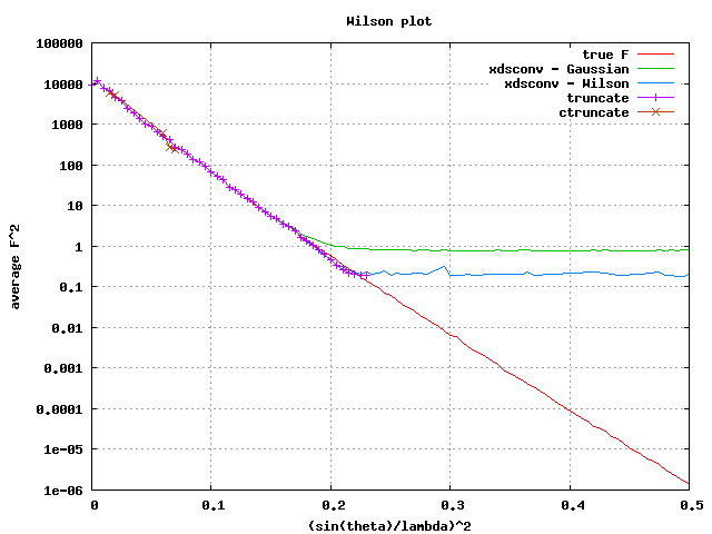 Hi James, Concerning XDSCONV, I cannot reproduce your plot. A Linux (64bit) program "test_xdsconv" which allows to input I, sigI, <I>, and mode, where I: measured intensity sigI: sigma(I) <I>: average I in resolution shell mode: -1/0/1 for truncated normal/acentric/centric prior is at ftp://turn5.biologie.uni-konstanz.de/pub/test_xdsconv . It allows to test individual combinations of I, sigI, <I> and find out what, according to French&Wilson 1978, the value of J, sigJ, F, sigF is (where J stands for the posterior intensity), according to the XDSCONV implementation. The user has to enter the numbers. Some example input and output is: 1 1 1 0 0.79788 0.60281 0.82218 0.34915 1 1 0.1 0 0.10851 0.10731 0.29235 0.15180 1 1 0.01 0 0.00993 0.01025 0.08854 0.04568 0.1 0.1 0.01 0 0.01085 0.01073 0.09245 0.04800 100 1 0.01 0 0.79788 0.60281 0.82218 0.34915 These results show that e.g. in a resolution shell with <I>=0.01 , the posterior (i.e. most likely given the prior) intensity is 0.00993. In other words, a strong intensity (I,sigI=1,1) in a weak-<I> is unexpected and not believable, and is thus strongly weighted down. The output of test_xdsconv is meant to help understand F&W1978 and its XDSCONV implementation, and I cannot find a problem with it. If anybody does, I'd love to hear about it.