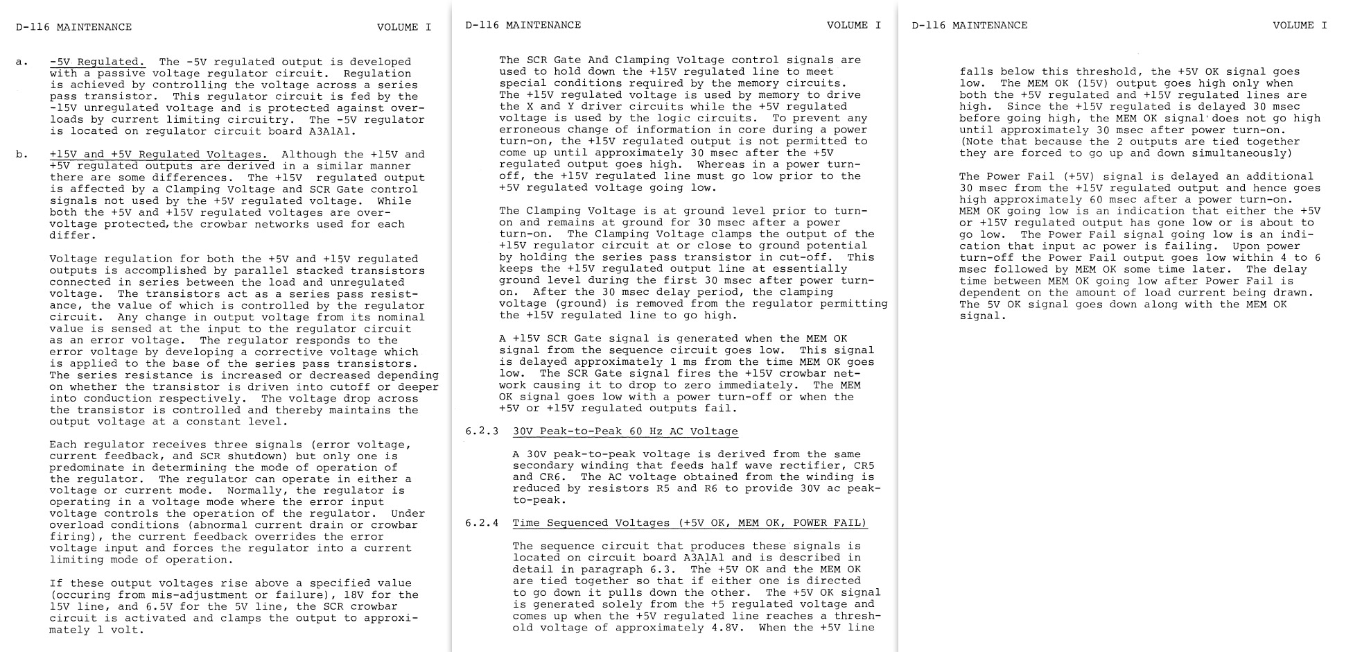 On Aug 19, 2017, at 12:10 PM, Dominique Carlier via cctalk <[email protected]> wrote: Maybe it's better to give us all the useful information these power supplies, moreover it might be useful to other people with the same computer. An overall bloc diagram of the D-116 power supply including G1 and G2. http://www.zeltrax.com/classiccmp_forum/psu_overall_bloc_diagram.jpg The complete schematics of the part of the power supply named G2. http://www.zeltrax.com/classiccmp_forum/g2_schematics.jpg A drawing of the regulation board of the power supply G2 with the physical locations of the components. http://www.zeltrax.com/classiccmp_forum/g2_regulator_board.jpg The schematics of this regulation board. http://www.zeltrax.com/classiccmp_forum/g2_regulator_board_schematics.jpg And a bit of literature concerning the principle of operation about the regulation with this PSU (you will understand better why I am a little bit lost ;-) This principle of regulation with a panoply of verification and Protection systems everywhere is unusual for me) http://www.zeltrax.com/classiccmp_forum/psu_regulation_principe.jpg I have already tried without the CPU board: same symptoms. Next step, try to check the capacitors in operation. And because all this is a little bit boring, here is, as a small gift, a photo gallery of the machine under different angles ;-) Ensemble http://www.zeltrax.com/classiccmp_forum/serie01/ensemble_01.jpg http://www.zeltrax.com/classiccmp_forum/serie01/ensemble_02.jpg <http://www.zeltrax.com/classiccmp_forum/serie01/ensemble_02.jpg> D-116 Front panel http://www.zeltrax.com/classiccmp_forum/serie01/d116_front_panel_01.jpg http://www.zeltrax.com/classiccmp_forum/serie01/d116_front_panel_02.jpg http://www.zeltrax.com/classiccmp_forum/serie01/d116_front_panel_03.jpg D-116 open rack http://www.zeltrax.com/classiccmp_forum/serie01/d116_open_01.jpg http://www.zeltrax.com/classiccmp_forum/serie01/d116_open_02.jpg G2 regulator board http://www.zeltrax.com/classiccmp_forum/serie01/g2_regulator_board.jpg Disk Pack drive Diablo Model 40 http://www.zeltrax.com/classiccmp_forum/serie01/diskpack_drive_01.jpg http://www.zeltrax.com/classiccmp_forum/serie01/diskpack_drive_02.jpg http://www.zeltrax.com/classiccmp_forum/serie01/diskpack_drive_03.jpg Mag-tape Pertec 8840A http://www.zeltrax.com/classiccmp_forum/serie01/pertec_close.jpg http://www.zeltrax.com/classiccmp_forum/serie01/pertec_open_01.jpg http://www.zeltrax.com/classiccmp_forum/serie01/pertec_open_02.jpg http://www.zeltrax.com/classiccmp_forum/serie01/pertec_open_03.jpg http://www.zeltrax.com/classiccmp_forum/serie01/pertec_open_04.jpg http://www.zeltrax.com/classiccmp_forum/serie01/pertec_open_05.jpg Drum printer Data Products model 2230 http://www.zeltrax.com/classiccmp_forum/serie01/printer_01.jpg http://www.zeltrax.com/classiccmp_forum/serie01/printer_02.jpg http://www.zeltrax.com/classiccmp_forum/serie01/printer_03.jpg Terminal Entrex http://www.zeltrax.com/classiccmp_forum/serie01/terminal.jpg http://www.zeltrax.com/classiccmp_forum/serie01/terminal_nacked.jpg Rear panel / connectors http://www.zeltrax.com/classiccmp_forum/serie01/rear_panel.jpg From inside http://www.zeltrax.com/classiccmp_forum/serie01/flat_cables.jpg http://www.zeltrax.com/classiccmp_forum/serie01/from_inside.jpg <http://www.zeltrax.com/classiccmp_forum/serie01/from_inside.jpg> Haa I can't wait to operate this heavy machine! ;-) Dominique