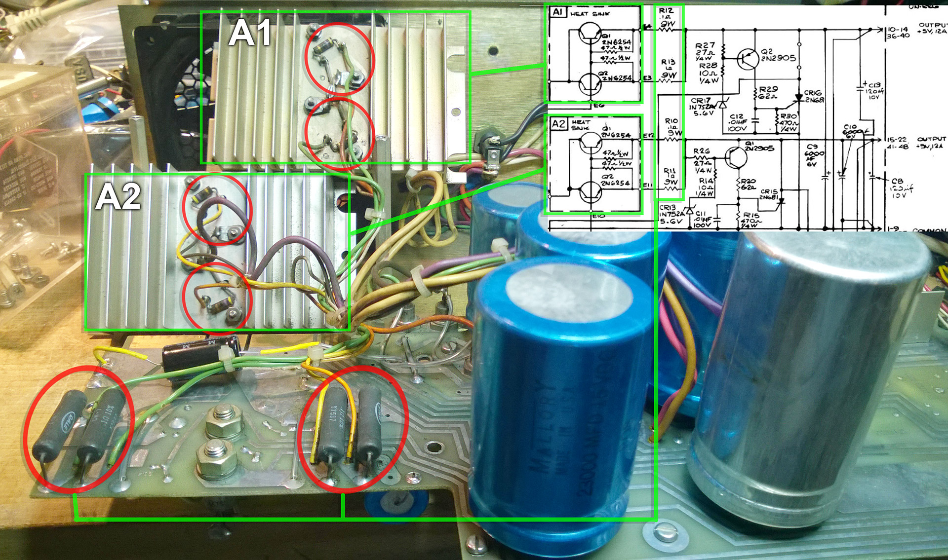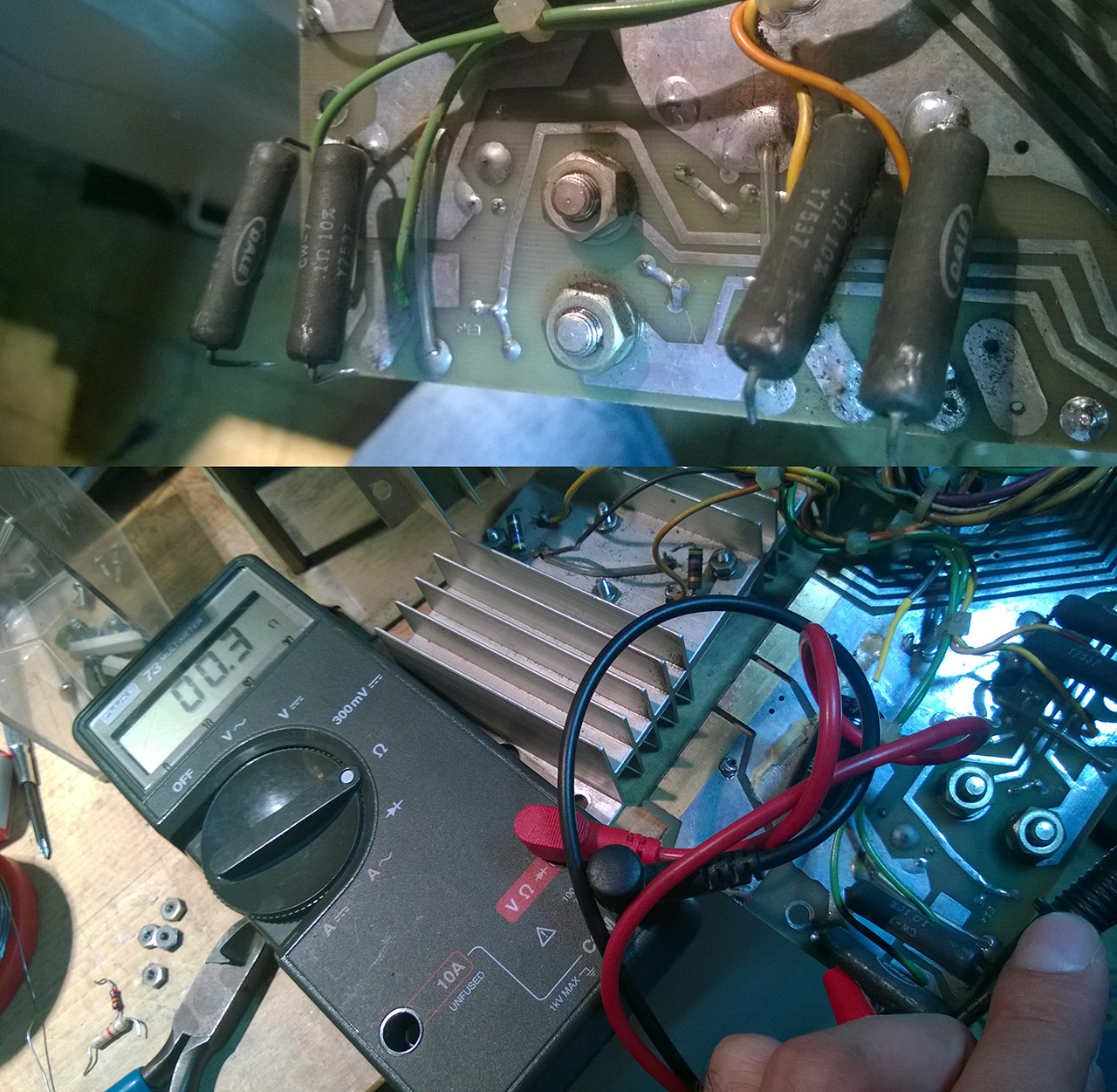 resistors on the heatsinks A1 and A2, and also checking the resistors of