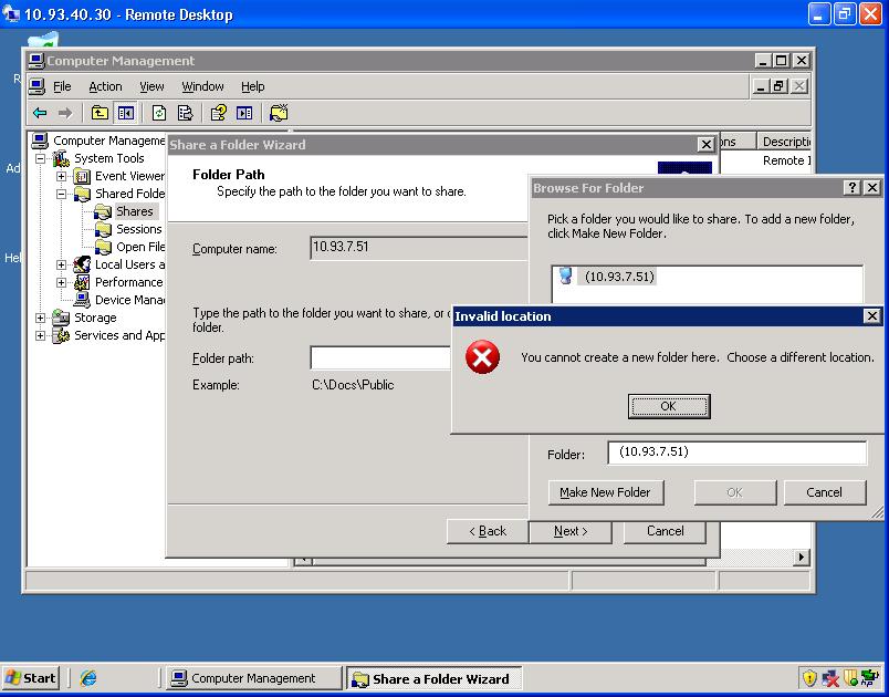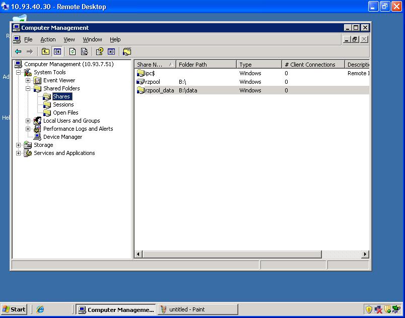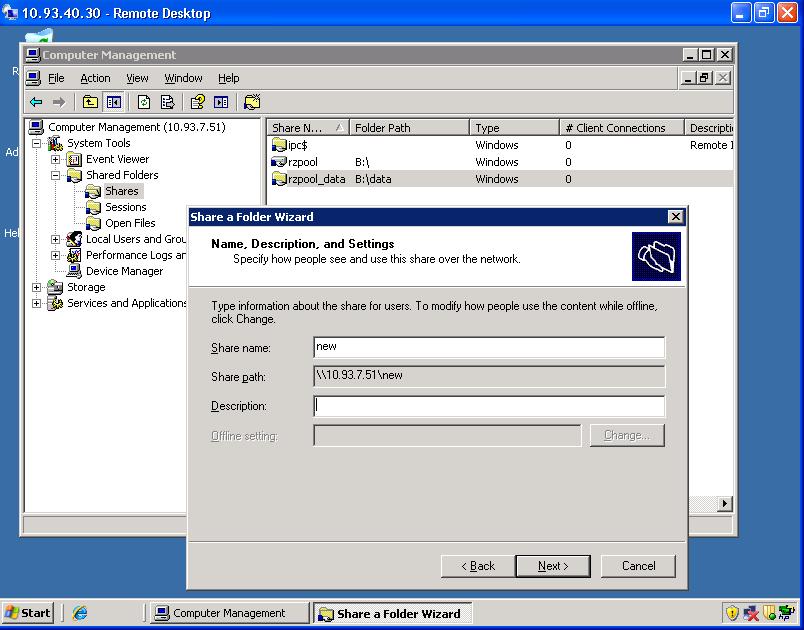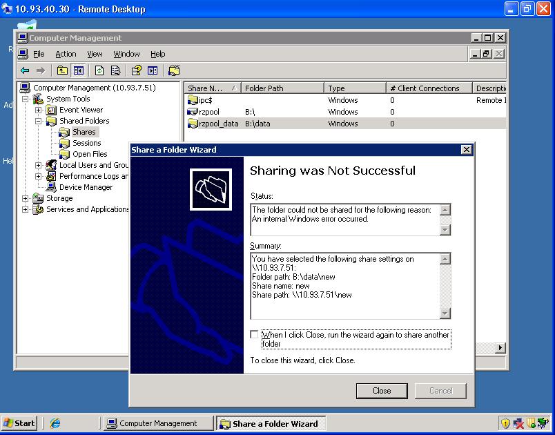 I can provide snoop logs between this windows server and the opensolaris server if that would help. Here is the list of shares from the opensolaris server: http://keeganm.com/tmp/1.JPG I tried to right click on 'Shares' on the left, going to 'Create new Share.' On the right of the dialogue box that pops up, i saw a 'browse' button for the location. Here is the error I get when i try to create a new folder: http://keeganm.com/tmp/2.JPG Since doing a browse didn't work, i decided to try to make a new folder this way. I chose b:\ because the other share has that path name. http://keeganm.com/tmp/3.JPG Result of previous screen http://keeganm.com/tmp/4.JPG Result of hitting next http://keeganm.com/tmp/5.JPG After hitting finish on that screen, I get this window. http://keeganm.com/tmp/6.JPG As you can see, there was some kind of 'internal windows error.' The new share did not show up after hitting 'close.' Thanks for your help. -- This message posted from opensolaris.org _______________________________________________ cifs-discuss mailing list cifs-discuss@opensolaris.org http://mail.opensolaris.org/mailman/listinfo/cifs-discuss