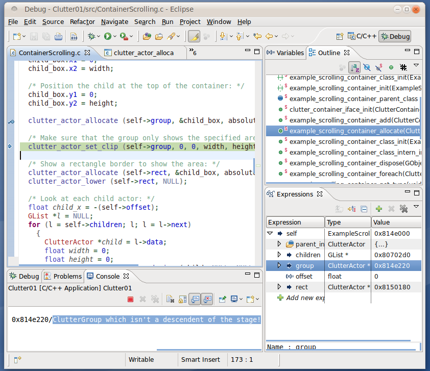 Hi All, I just found my way to Clutter and like it so far. I'm following the tutorial at: http://www.openismus.com/documents/clutter_tutorial/1.0/docs/tutorial/html/scrolling-container-example.html#figure-scrolling-container...but i get this warning: Clutter-WARNING **: Spurious clutter_actor_allocate called for actor 0x814e220/ClutterGroup which isn't a descendent of the stage!screenshot: http://i235.photobucket.com/albums/ee85/izzysoft/Clutter/ClutterGroup_01.png It doesn't crash, but Nothing shows up the window.Anyone else come across this warning? Thanks,Izzy.