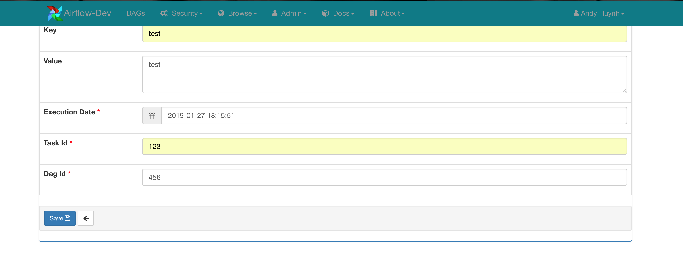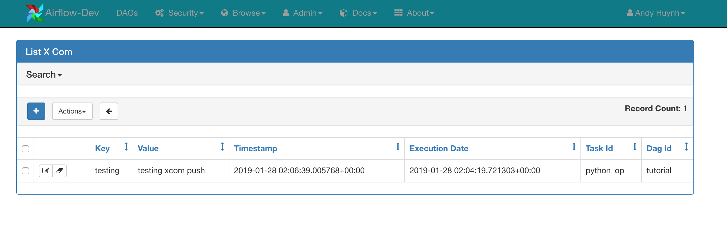 andyh1203 commented on issue #4600: [AIRFLOW-3765] Fix for create/update xcom values using the admin UI URL: https://github.com/apache/airflow/pull/4600#issuecomment-457980056 Hi @XD-DENG, good catch. Will take that into future consideration! On another note, seems like after switching to the RBAC UI, I'm unable to manually create an XCom entry now:  Hitting the save button doesn't seem to create a new XCom entry in the metadata db. XCom pushes are still working as expected: