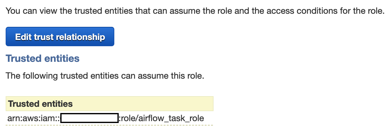 Hey @TKorr it seems to me that your problem is AWS IAM related at this point. You have two roles, Assumer and Target (assumer assumes the target role). In this example, the Target role must have a Trust Relationship saying that the Assumer role is allowed to assume it. Here's an example from my IAM console  In it, I am allowing `airflow_task_role` (a role under which my Airflow worker is running) to assume another role which would grant certain permissions (S3 access in my case). The issue with the missing token and STS credentials (which PR #11227 is trying to solve) only showed itself after I was able to assume the role. In your case you can't even assume the role from Airflow. ---------------------------------------------------------------- This is an automated message from the Apache Git Service. To respond to the message, please log on to GitHub and use the URL above to go to the specific comment. For queries about this service, please contact Infrastructure at: [email protected]