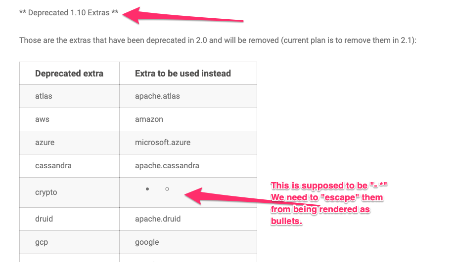 There are some minor style issues in docs `Extra Packages Reference` (http://apache-airflow-docs.s3-website.eu-central-1.amazonaws.com/docs/apache-airflow/latest/extra-packages-ref.html) - Header (bold) style is wrong - Some symbols are not escaped  <!-- Thank you for contributing! Please make sure that your code changes are covered with tests. And in case of new features or big changes remember to adjust the documentation. Feel free to ping committers for the review! In case of existing issue, reference it using one of the following: closes: #ISSUE related: #ISSUE How to write a good git commit message: http://chris.beams.io/posts/git-commit/ --> --- **^ Add meaningful description above** Read the **[Pull Request Guidelines](https://github.com/apache/airflow/blob/master/CONTRIBUTING.rst#pull-request-guidelines)** for more information. In case of fundamental code change, Airflow Improvement Proposal ([AIP](https://cwiki.apache.org/confluence/display/AIRFLOW/Airflow+Improvements+Proposals)) is needed. In case of a new dependency, check compliance with the [ASF 3rd Party License Policy](https://www.apache.org/legal/resolved.html#category-x). In case of backwards incompatible changes please leave a note in [UPDATING.md](https://github.com/apache/airflow/blob/master/UPDATING.md). ---------------------------------------------------------------- This is an automated message from the Apache Git Service. To respond to the message, please log on to GitHub and use the URL above to go to the specific comment. For queries about this service, please contact Infrastructure at: [email protected]