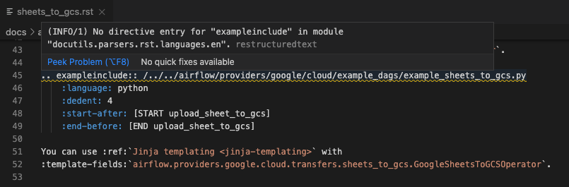 > @RNHTTR Where do you see this error? Do you build the documentation according to the instructions? https://github.com/apache/airflow/blob/master/docs/README.rst I see it in every DAG documentation .rst file:  Thanks for the link to the documentation instructions. I tried `./breeze build-docs -- --package-filter apache-airflow-providers-google`, but this results in an error that I can't reconcile: ```#################### Docs build errors summary #################### ==================== apache-airflow-providers-google ==================== -------------------- Error 1 -------------------- Sphinx returned non-zero exit status: -9. ################################################## #################### Spelling errors summary #################### ==================== apache-airflow-providers-google ==================== -------------------- Error 1 -------------------- Sphinx spellcheck returned non-zero exit status: -9. ================================================== If the spelling is correct, add the spelling to docs/spelling_wordlist.txt or use the spelling directive. Check https://sphinxcontrib-spelling.readthedocs.io/en/latest/customize.html#private-dictionaries for more details. ################################################## The documentation has errors. #################### Packages errors summary #################### Package name Count of doc build errors Count of spelling errors ------------------------------- --------------------------- -------------------------- apache-airflow-providers-google 1 1 ################################################## If you need help, write to #documentation channel on Airflow's Slack. Channel link: https://apache-airflow.slack.com/archives/CJ1LVREHX Invitation link: https://s.apache.org/airflow-slack ########################################################################################### EXIT CODE: 1 in container (See above for error message). Below is the output of the last action! *** BEGINNING OF THE LAST COMMAND OUTPUT *** *** END OF THE LAST COMMAND OUTPUT *** EXIT CODE: 1 in container. The actual error might be above the output!``` ---------------------------------------------------------------- This is an automated message from the Apache Git Service. To respond to the message, please log on to GitHub and use the URL above to go to the specific comment. For queries about this service, please contact Infrastructure at: [email protected]