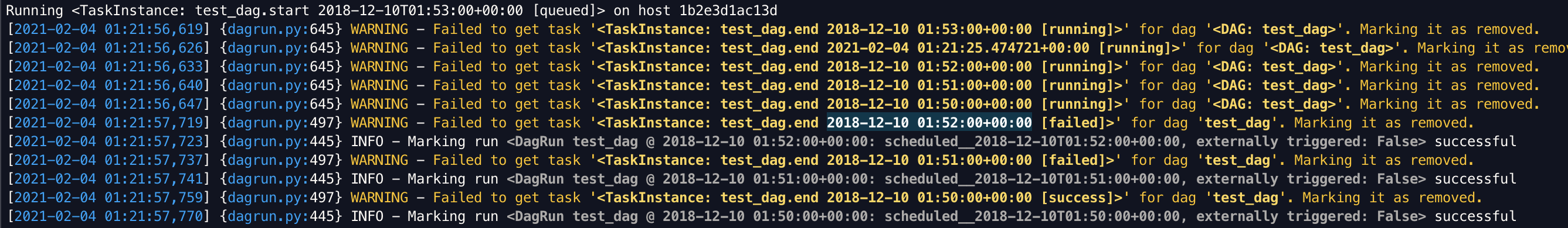 closes https://github.com/apache/airflow/issues/13464 **Before**: When a DAG is running, and I delete the task from the running DAG, the scheduler fails. When using Docker, upon automatic restart of the scheduler, the scheduler just fails again, perpetually.  **After**:  <!-- Thank you for contributing! Please make sure that your code changes are covered with tests. And in case of new features or big changes remember to adjust the documentation. Feel free to ping committers for the review! In case of existing issue, reference it using one of the following: closes: #ISSUE related: #ISSUE How to write a good git commit message: http://chris.beams.io/posts/git-commit/ --> --- **^ Add meaningful description above** Read the **[Pull Request Guidelines](https://github.com/apache/airflow/blob/master/CONTRIBUTING.rst#pull-request-guidelines)** for more information. In case of fundamental code change, Airflow Improvement Proposal ([AIP](https://cwiki.apache.org/confluence/display/AIRFLOW/Airflow+Improvements+Proposals)) is needed. In case of a new dependency, check compliance with the [ASF 3rd Party License Policy](https://www.apache.org/legal/resolved.html#category-x). In case of backwards incompatible changes please leave a note in [UPDATING.md](https://github.com/apache/airflow/blob/master/UPDATING.md). ---------------------------------------------------------------- This is an automated message from the Apache Git Service. To respond to the message, please log on to GitHub and use the URL above to go to the specific comment. For queries about this service, please contact Infrastructure at: [email protected]