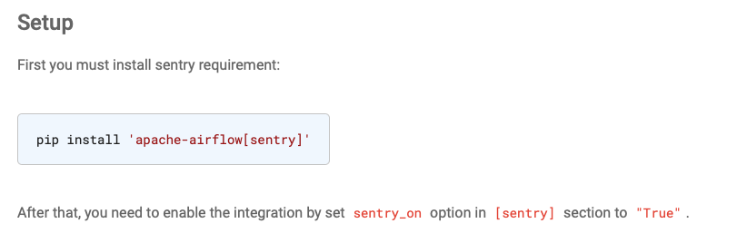 <!-- Welcome to Apache Airflow! For a smooth issue process, try to answer the following questions. Don't worry if they're not all applicable; just try to include what you can :-) If you need to include code snippets or logs, please put them in fenced code blocks. If they're super-long, please use the details tag like <details><summary>super-long log</summary> lots of stuff </details> Please delete these comment blocks before submitting the issue. --> <!-- IMPORTANT!!! PLEASE CHECK "SIMILAR TO X EXISTING ISSUES" OPTION IF VISIBLE NEXT TO "SUBMIT NEW ISSUE" BUTTON!!! PLEASE CHECK IF THIS ISSUE HAS BEEN REPORTED PREVIOUSLY USING SEARCH!!! Please complete the next sections or the issue will be closed. These questions are the first thing we need to know to understand the context. --> **Apache Airflow version**: 2.0.1 **Kubernetes version (if you are using kubernetes)** (use `kubectl version`): N/A **Environment**: N/A **What happened**: The docs here https://airflow.apache.org/docs/apache-airflow/stable/logging-monitoring/errors.html indicate that `sentry_on=True` is the config, however the correct config option is `sentry_on=True` **What you expected to happen**: **How to reproduce it**:  ---------------------------------------------------------------- This is an automated message from the Apache Git Service. To respond to the message, please log on to GitHub and use the URL above to go to the specific comment. For queries about this service, please contact Infrastructure at: [email protected]