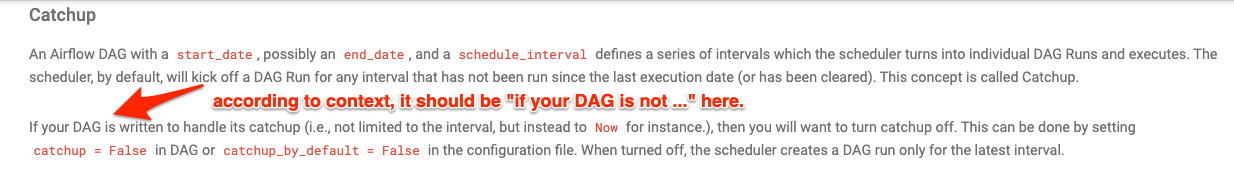 - Fix an apparent mistake in [doc relating to `catchup`](https://airflow.apache.org/docs/apache-airflow/2.0.1/dag-run.html#catchup)  - Fix typo `pickable` (should be `picklable`) <!-- Thank you for contributing! Please make sure that your code changes are covered with tests. And in case of new features or big changes remember to adjust the documentation. Feel free to ping committers for the review! In case of existing issue, reference it using one of the following: closes: #ISSUE related: #ISSUE How to write a good git commit message: http://chris.beams.io/posts/git-commit/ --> --- **^ Add meaningful description above** Read the **[Pull Request Guidelines](https://github.com/apache/airflow/blob/master/CONTRIBUTING.rst#pull-request-guidelines)** for more information. In case of fundamental code change, Airflow Improvement Proposal ([AIP](https://cwiki.apache.org/confluence/display/AIRFLOW/Airflow+Improvements+Proposals)) is needed. In case of a new dependency, check compliance with the [ASF 3rd Party License Policy](https://www.apache.org/legal/resolved.html#category-x). In case of backwards incompatible changes please leave a note in [UPDATING.md](https://github.com/apache/airflow/blob/master/UPDATING.md). -- This is an automated message from the Apache Git Service. To respond to the message, please log on to GitHub and use the URL above to go to the specific comment. For queries about this service, please contact Infrastructure at: [email protected]
