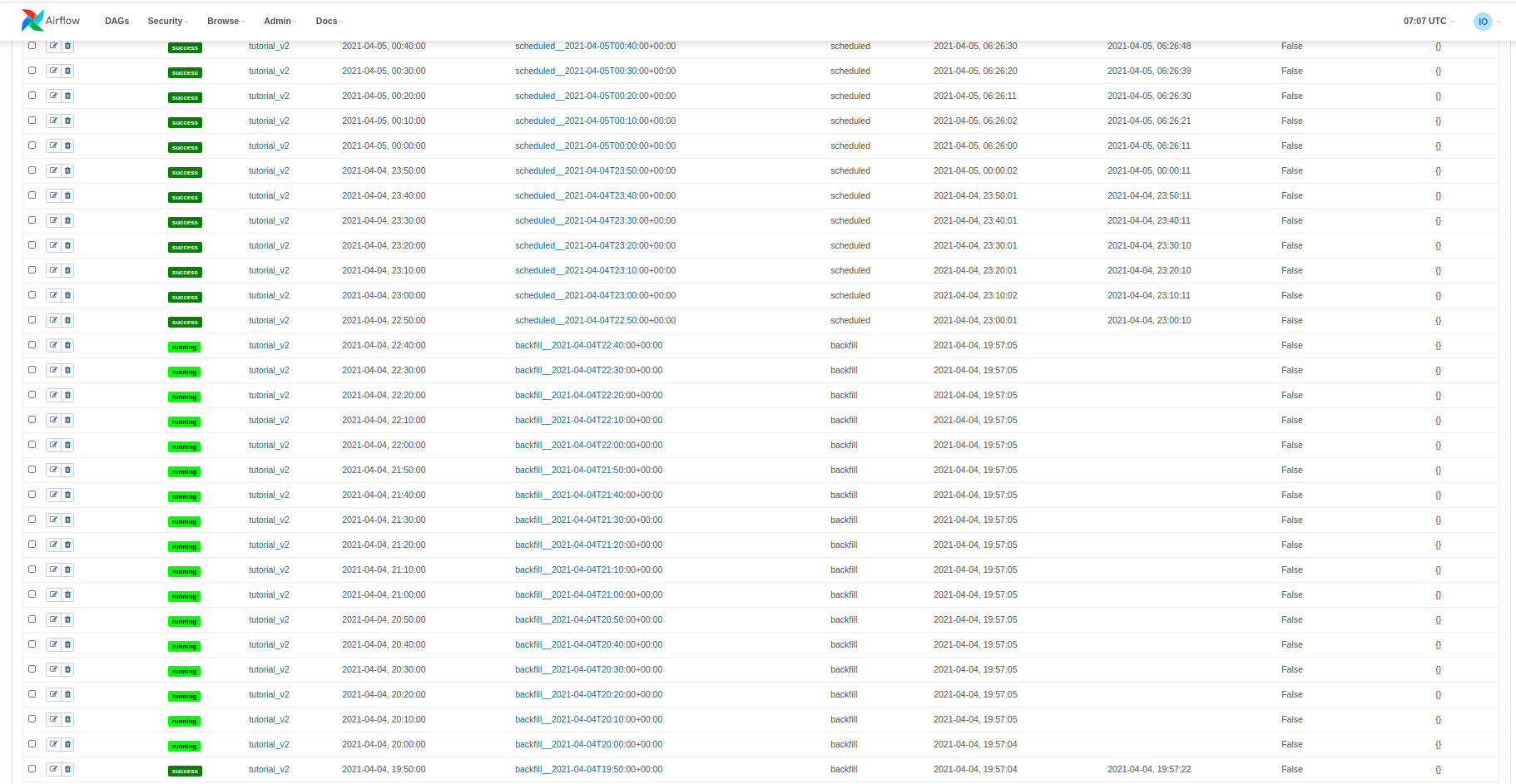 $ airflow dags backfill tutorial_v2 -s 2021-04-04-19:50 -e 2021-04-06