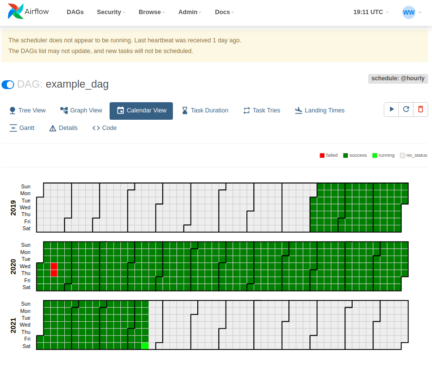 <!-- Thank you for contributing! Please make sure that your code changes are covered with tests. And in case of new features or big changes remember to adjust the documentation. Feel free to ping committers for the review! In case of existing issue, reference it using one of the following: closes: #ISSUE related: #ISSUE How to write a good git commit message: http://chris.beams.io/posts/git-commit/ --> # Motivation Introduce a DAG Calendar View to provide visibility over the full state of the dag by displaying the aggregated dag runs' states in a calendar. This makes it possible to monitor the state of thousands of dag runs in a single view that is concise and easy to understand. It is particularly useful to monitor the state of large backfills:  Each day is displayed with a color according to the dag runs' states for that day: - If at least one dag run has failed for a day, the day will be displayed as "failed". - If all dag runs have succeeded, the day will be shown as "succeeded". - If there are still running dag runs (and no failed dag run) for that day, the day will be shown as "running". A tooltip, for each day, gives the exact number of dag runs in each state for the day.  Clicking on a day redirects to the tree view for that day to show the task instances for that day. # Implementation - New `/calendar` endpoint in `views.py`. This view returns, for each day, the number of dag run in each state. Thus, only the `dag_run` table is queried, and the query returns at most 3 * days records. Thus, this view puts little strain on the database, even for dags with a large number of task instances. - New `calendar.html` template, `calendar.js` and `calendar.css` static files. The calendar view is implemented usng d3, thus no additional dependency has been introduced. The proposal has been discussed on the dev mailing list: https://lists.apache.org/thread.html/r6f2ea3f83d268a665ac63219553718ed089a01e9530627cca0572ab1%40%3Cdev.airflow.apache.org%3E -- This is an automated message from the Apache Git Service. To respond to the message, please log on to GitHub and use the URL above to go to the specific comment. For queries about this service, please contact Infrastructure at: [email protected]