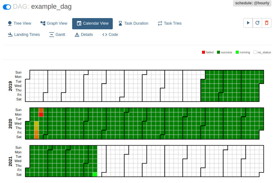 @bbovenzi I have pushed the change to use `interpolateHsl` (so that we go from green to read going through yellow), and raised the interpolation floor to 0.5 so that days with just a few failures don't appear in a green that is close to the "success" green and would thus "hide" the failures. The current result is the following:  Let me know what you think :) -- This is an automated message from the Apache Git Service. To respond to the message, please log on to GitHub and use the URL above to go to the specific comment. For queries about this service, please contact Infrastructure at: [email protected]