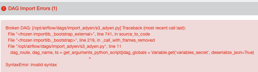 I have just updated from Airflow 1.10.14 to Airflow 2.0.2 and I am getting an error of this kind in a lot of dags. I have several python scripts in python files in my dags subfolders. Here is the error I get in the UI:  However, the code of the DAG is the following: ``` from utilities.files import get_arguments_python_script dag_route, dag_name, ts = get_arguments_python_script() dag_globals = Variable.get('variables_secret', deserialize_json=True) ``` I am using airflow with docker-compose (official image) and I have already restarted it several times and the error persists. Moreover, if I click on the DAG, I can successfully enter it and even run the script. Also, in the logs of the containers of the webserver and the scheduler, there are no error logs -- This is an automated message from the Apache Git Service. To respond to the message, please log on to GitHub and use the URL above to go to the specific comment. For queries about this service, please contact Infrastructure at: [email protected]