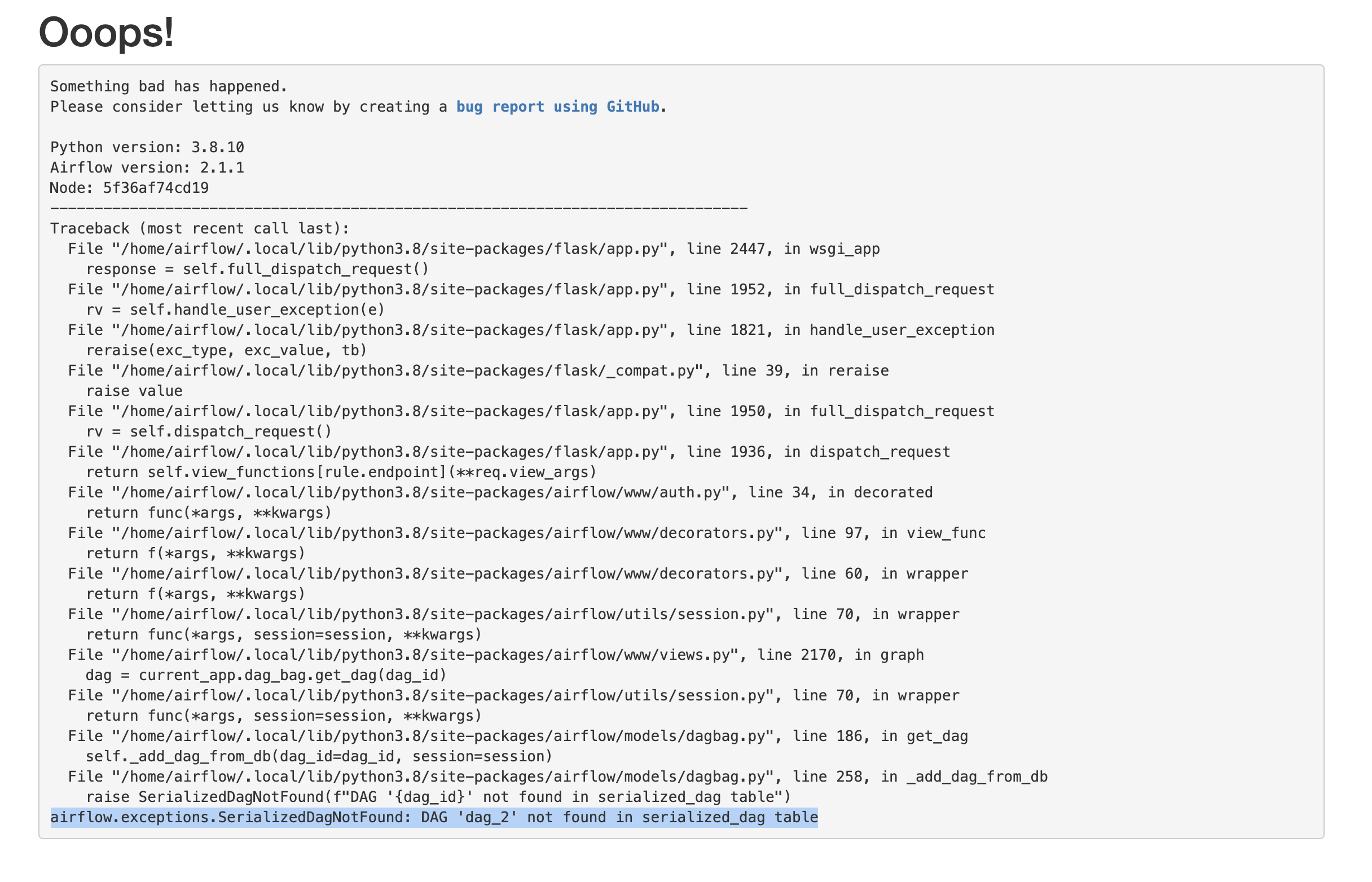 If I try to access the DAG after file deletion the Web UI I receive the SerializedDagNotFound exception  -- This is an automated message from the Apache Git Service. To respond to the message, please log on to GitHub and use the URL above to go to the specific comment. To unsubscribe, e-mail: [email protected] For queries about this service, please contact Infrastructure at: [email protected]