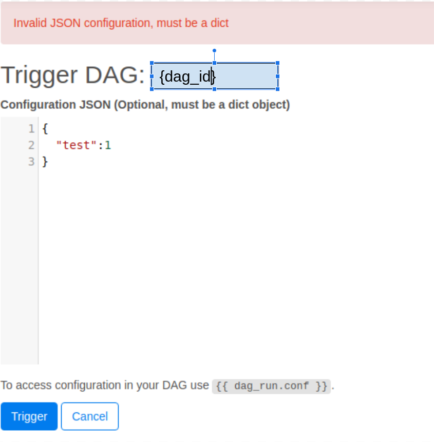 <!-- Welcome to Apache Airflow! For a smooth issue process, try to answer the following questions. Don't worry if they're not all applicable; just try to include what you can :-) If you need to include code snippets or logs, please put them in fenced code blocks. If they're super-long, please use the details tag like <details><summary>super-long log</summary> lots of stuff </details> Please delete these comment blocks before submitting the issue. --> <!-- IMPORTANT!!! PLEASE CHECK "SIMILAR TO X EXISTING ISSUES" OPTION IF VISIBLE NEXT TO "SUBMIT NEW ISSUE" BUTTON!!! PLEASE CHECK IF THIS ISSUE HAS BEEN REPORTED PREVIOUSLY USING SEARCH!!! Please complete the next sections or the issue will be closed. These questions are the first thing we need to know to understand the context. --> **Apache Airflow version**: **Kubernetes version (if you are using kubernetes)** (use `kubectl version`): 1.18+ **Environment**: - **Cloud provider or hardware configuration**: GCP - **OS** (e.g. from /etc/os-release): - **Kernel** (e.g. `uname -a`): - **Install tools**: - **Others**: **What happened**: Tried to trigger a dag with config but got an error saying "Invalid JSON configuration, must be a dict" This worked in 2.1.0  <!-- (please include exact error messages if you can) --> **What you expected to happen**: <!-- What do you think went wrong? --> **How to reproduce it**: Running airflow 2.1.1 try trigger a dag with config **Anything else we need to know**: How often does this problem occur? Once? Every time etc? Always Any relevant logs to include? Put them here in side a detail tag: <details><summary>webserver_logs</summary> ``` 10.60.7.19 - - [09/Jul/2021:10:00:46 +0000] "POST /trigger?dag_id={dag_id}&origin=%2Ftree%3Fdag_id%3D{dag_id}HTTP/1.1" 200 19096 "https://{airflow-domain}/trigger?dag_id={dag_id}&origin=%2Ftree%3Fdag_id%3D{dag_id}" "Mozilla/5.0 (X11; Linux x86_64) AppleWebKit/537.36 (KHTML, like Gecko) Chrome/91.0.4472.114 Safari/537.36" 10.60.7.19 - - [09/Jul/2021:10:00:46 +0000] "GET /static/dist/lint.css HTTP/1.1" 304 0 "https://{airflow-domain}/trigger?dag_id={dag_id}&origin=%2Ftree%3Fdag_id%3D{dag_id}" "Mozilla/5.0 (X11; Linux x86_64) AppleWebKit/537.36 (KHTML, like Gecko) Chrome/91.0.4472.114 Safari/537.36" 10.60.7.19 - - [09/Jul/2021:10:00:46 +0000] "GET /static/dist/codemirror.css HTTP/1.1" 304 0 "https://{airflow-domain}/trigger?dag_id={dag_id}&origin=%2Ftree%3Fdag_id%3D{dag_id}" "Mozilla/5.0 (X11; Linux x86_64) AppleWebKit/537.36 (KHTML, like Gecko) Chrome/91.0.4472.114 Safari/537.36" ``` </details> -- This is an automated message from the Apache Git Service. To respond to the message, please log on to GitHub and use the URL above to go to the specific comment. To unsubscribe, e-mail: [email protected] For queries about this service, please contact Infrastructure at: [email protected]