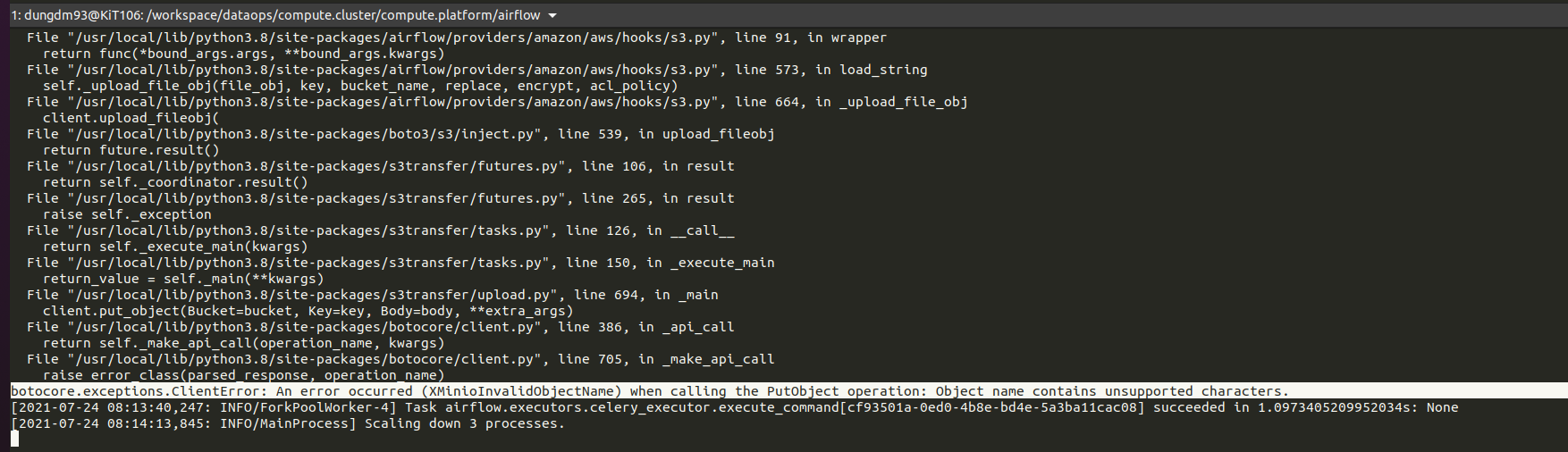 **Apache Airflow version**: `2.1.2+d25854dd413aa68ea70fb1ade7fe01425f456192` **Kubernetes version (if you are using kubernetes)** (use `kubectl version`): `v1.19.10-gke.1600` **Environment**: - **Cloud provider or hardware configuration**: - **OS** (e.g. from /etc/os-release): - **Kernel** (e.g. `uname -a`): - **Install tools**: - **Others**: **What happened**: My airflow cluster use S3 remote logs to MinIO (a S3 compatible object store) follow [this guide](https://airflow.apache.org/docs/apache-airflow-providers-amazon/stable/logging/s3-task-handler.html). But when some (example) DAG run, I got the following error:  After some investigation, I find out that airflow don't truncate `s3://<bucket>` part from `remote_base_log_folder` when uploading logs to S3.  (`mc admin trace <target>`) **What you expected to happen**: `s3://<bucket>` MUST be truncated from `remote_base_log_folder` or allow config `remote_base_log_folder` without `s3://` prefix and bucket. (only base path) **How to reproduce it**: * Airflow config:  * Airflow logs connection:  -- This is an automated message from the Apache Git Service. To respond to the message, please log on to GitHub and use the URL above to go to the specific comment. To unsubscribe, e-mail: [email protected] For queries about this service, please contact Infrastructure at: [email protected]