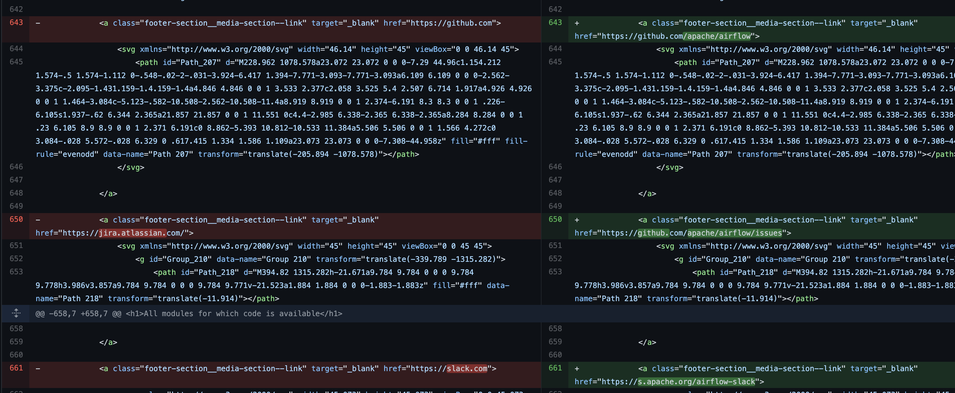 > Hmmm. Those are a bit more than latest -> stable.. Are those changes right ? Yup, auto-generated. Fixes link like twitter.com to twitter.com/ApacheAirflow same for Github and other links  -- This is an automated message from the Apache Git Service. To respond to the message, please log on to GitHub and use the URL above to go to the specific comment. To unsubscribe, e-mail: [email protected] For queries about this service, please contact Infrastructure at: [email protected]