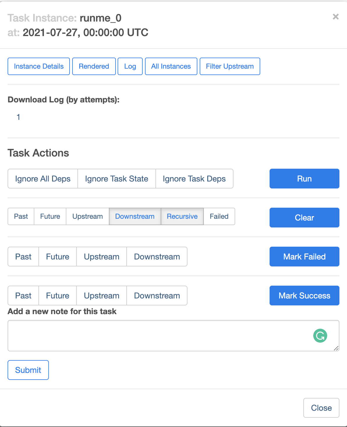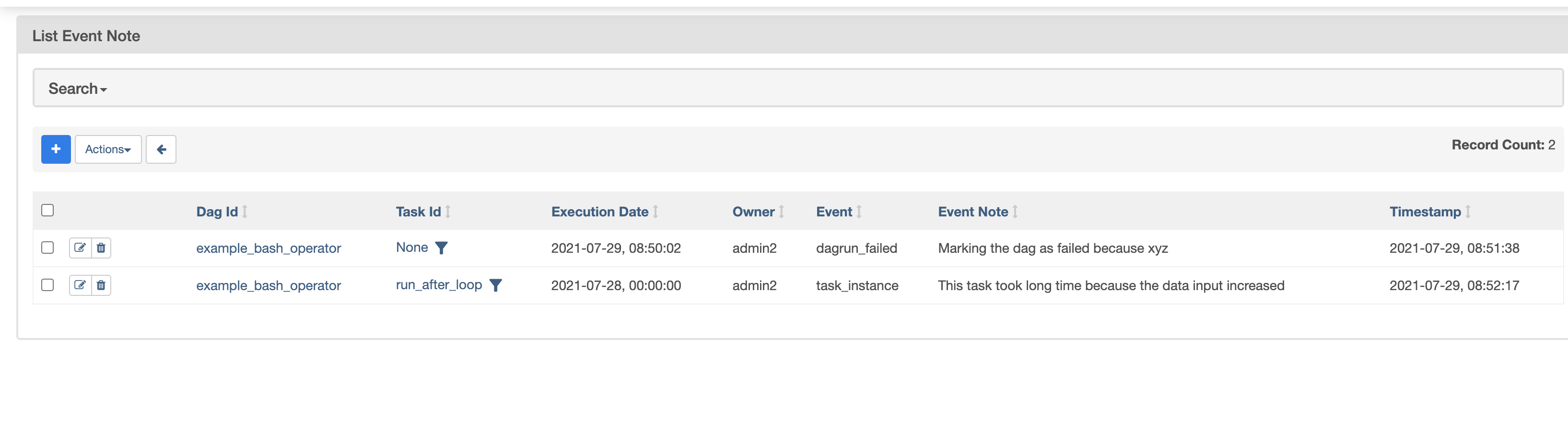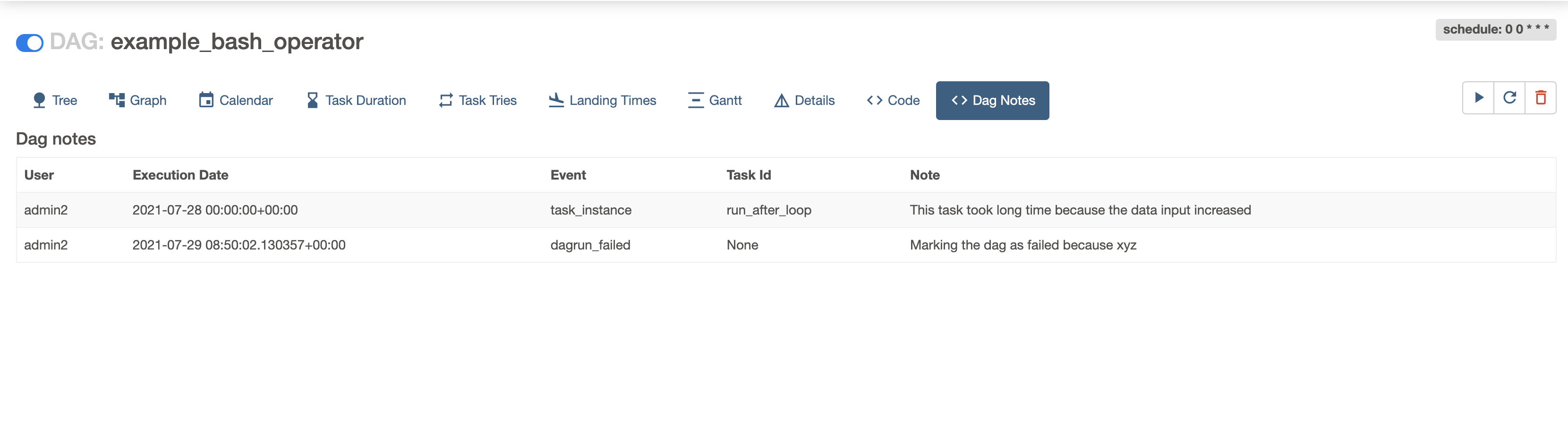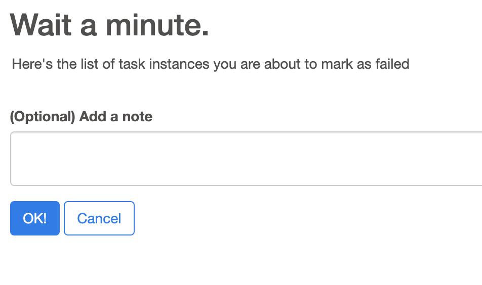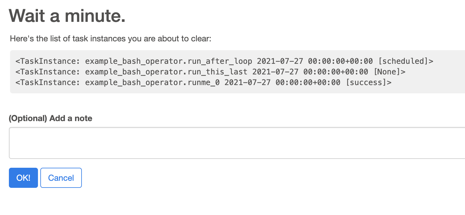 Adding your images to GitHub itself so we can check those screenshots even after a week > To add a note related to a task instance (which was kind of the original implementation)  > This is added to every "confirm" operation (clear, mark failed, mark success)  > same as before  > This is for manual triggering (Clearly needs a bit of restyling 😄 )  > This is a new view in the dag that collects all the notes related to that dag (Again, some styling is missing, the icon probably should be changed)  > Note menu  -- This is an automated message from the Apache Git Service. To respond to the message, please log on to GitHub and use the URL above to go to the specific comment. To unsubscribe, e-mail: [email protected] For queries about this service, please contact Infrastructure at: [email protected]