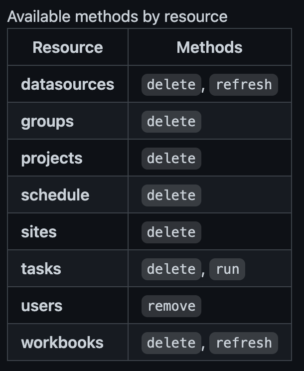 ########## File path: docs/apache-airflow-providers-tableau/operators.rst ########## @@ -0,0 +1,101 @@ +.. Licensed to the Apache Software Foundation (ASF) under one + or more contributor license agreements. See the NOTICE file + distributed with this work for additional information + regarding copyright ownership. The ASF licenses this file + to you under the Apache License, Version 2.0 (the + "License"); you may not use this file except in compliance + with the License. You may obtain a copy of the License at + + .. http://www.apache.org/licenses/LICENSE-2.0 + + .. Unless required by applicable law or agreed to in writing, + software distributed under the License is distributed on an + "AS IS" BASIS, WITHOUT WARRANTIES OR CONDITIONS OF ANY + KIND, either express or implied. See the License for the + specific language governing permissions and limitations + under the License. + + + +.. _howto/operator:TableauOperator: + +TableauOperator +=============== + +Use the :class:`~airflow.providers.tableau.operators.TableauOperator` to execute +Tableau server client python commands in a `Tableau <https://tableau.github.io/server-client-python/docs/api-ref>`__. + + +Using the Operator +^^^^^^^^^^^^^^^^^^ + +| **resource**: The name of the resource to use. **str** +| **method**: The name of the resource's method to execute. **str** +| **find**: The reference of resource that will receive the action. **str** +| **match_with**: The resource field name to be matched with find parameter. **str** - Default: **id** +| **site_id**: The id of the site where the workbook belongs to. **str** - Default: **None** +| **blocking_refresh**: By default the extract refresh will be blocking means it will wait until it has finished. **bool** - Default: **True** +| **check_interval**: time in seconds that the job should wait in between each instance state checks until operation is completed. **float** - Default: **20** +| **tableau_conn_id**: The credentials to authenticate to the Tableau Server. **str** - Default: **tableau_default** +| +| + + + +.. list-table:: Available methods by resource Review comment: I didn’t find a way to center it. I changed the table format to be clearer  -- This is an automated message from the Apache Git Service. To respond to the message, please log on to GitHub and use the URL above to go to the specific comment. To unsubscribe, e-mail: [email protected] For queries about this service, please contact Infrastructure at: [email protected]