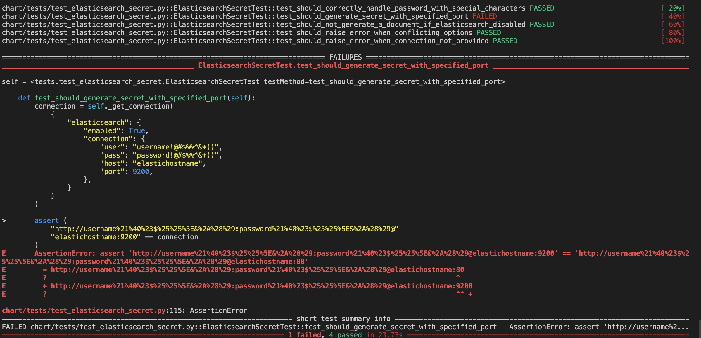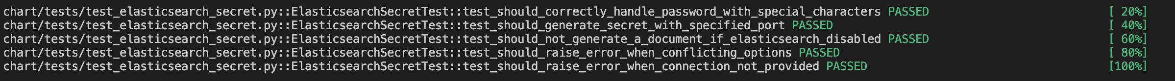 I wrote new test coverage. Here's my local test result. with original template ``` root@cbffb11c21aa:/opt/airflow# pytest chart/tests/test_elasticsearch_secret.py ```  with fixed template ``` root@cbffb11c21aa:/opt/airflow# pytest chart/tests/test_elasticsearch_secret.py ```  And also, Should default port be 80? As far as i know, Elasticsearch uses port 9200 as default. -- This is an automated message from the Apache Git Service. To respond to the message, please log on to GitHub and use the URL above to go to the specific comment. To unsubscribe, e-mail: [email protected] For queries about this service, please contact Infrastructure at: [email protected]