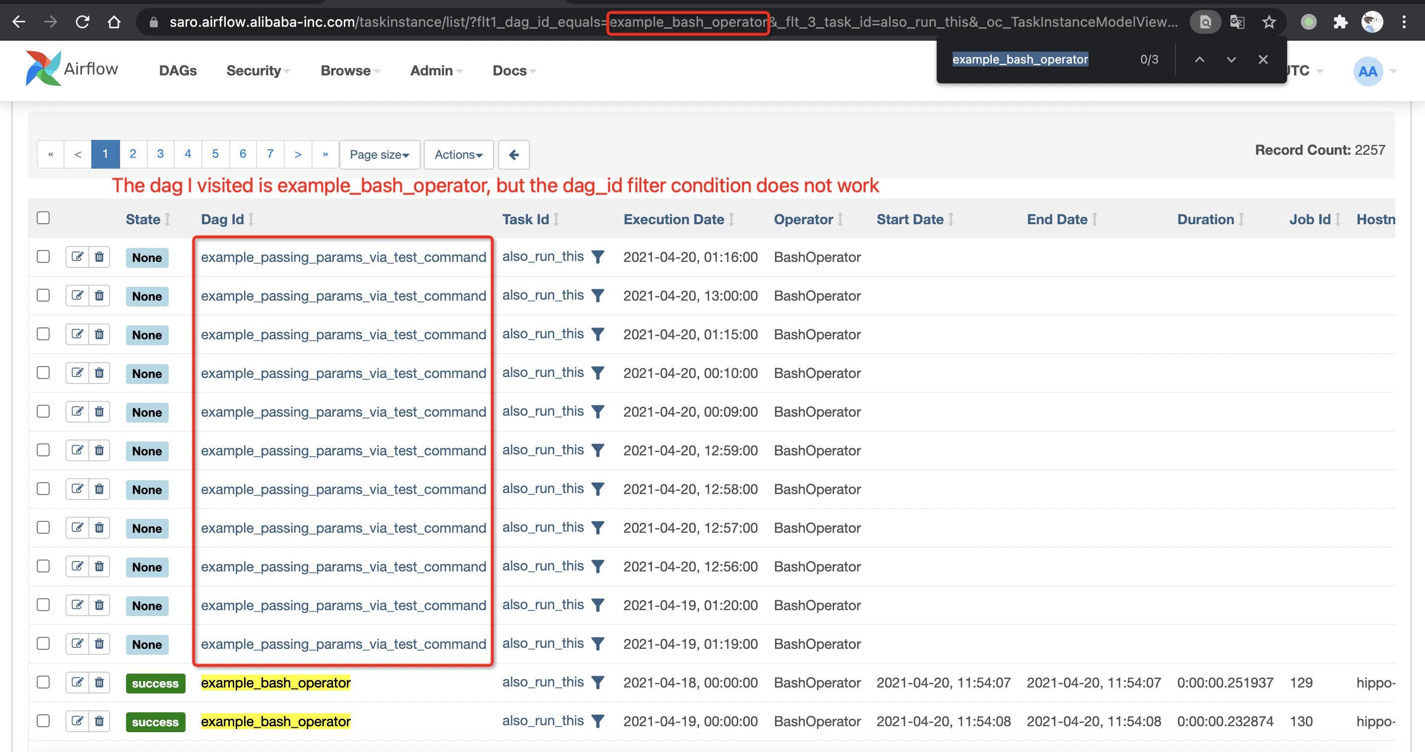 <!-- Welcome to Apache Airflow! For a smooth issue process, try to answer the following questions. Don't worry if they're not all applicable; just try to include what you can :-) If you need to include code snippets or logs, please put them in fenced code blocks. If they're super-long, please use the details tag like <details><summary>super-long log</summary> lots of stuff </details> Please delete these comment blocks before submitting the issue. --> <!-- IMPORTANT!!! PLEASE CHECK "SIMILAR TO X EXISTING ISSUES" OPTION IF VISIBLE NEXT TO "SUBMIT NEW ISSUE" BUTTON!!! PLEASE CHECK IF THIS ISSUE HAS BEEN REPORTED PREVIOUSLY USING SEARCH!!! Please complete the next sections or the issue will be closed. These questions are the first thing we need to know to understand the context. --> **Apache Airflow version**: 2.1.0 **Apache Airflow Provider versions** (please include all providers that are relevant to your bug): <!-- You can get a complete list of your provider versions with `pip freeze | grep apache-airflow-providers`. --> **Kubernetes version (if you are using kubernetes)** (use `kubectl version`): **Environment**: - **Cloud provider or hardware configuration**: - **OS** (e.g. from /etc/os-release): - **Kernel** (e.g. `uname -a`): - **Install tools**: pip - **Others**: **What happened**: I click the sample dag and my link is: http://127.0.0.1:8080/graph?dag_id=example_bash_operator   The dag I visited is `example_bash_operator`, but the dag_id filter condition does not work. After the link jumps, all tasks related to `also_run_this` are displayed.  <!-- (please include exact error messages if you can) --> **What you expected to happen**: Only display tasks related to `example_bash_operator`, such as  <!-- What do you think went wrong? --> **How to reproduce it**: Run airflow by command `airflow webserver`, visit this link: http://127.0.0.1:8080/graph?dag_id=example_bash_operator, and finally click the `All Instances` button <!--- As minimally and precisely as possible. Keep in mind we do not have access to your cluster or dags. If you are using kubernetes, please attempt to recreate the issue using minikube or kind. ## Install minikube/kind - Minikube https://minikube.sigs.k8s.io/docs/start/ - Kind https://kind.sigs.k8s.io/docs/user/quick-start/ If this is a UI bug, please provide a screenshot of the bug or a link to a youtube video of the bug in action You can include images using the .md style of  To record a screencast, mac users can use QuickTime and then create an unlisted youtube video with the resulting .mov file. ---> **Anything else we need to know**: If this is a bug, I can draft a PR to fix it <!-- How often does this problem occur? Once? Every time etc? Any relevant logs to include? Put them here in side a detail tag: <details><summary>x.log</summary> lots of stuff </details> --> -- This is an automated message from the Apache Git Service. To respond to the message, please log on to GitHub and use the URL above to go to the specific comment. To unsubscribe, e-mail: [email protected] For queries about this service, please contact Infrastructure at: [email protected]