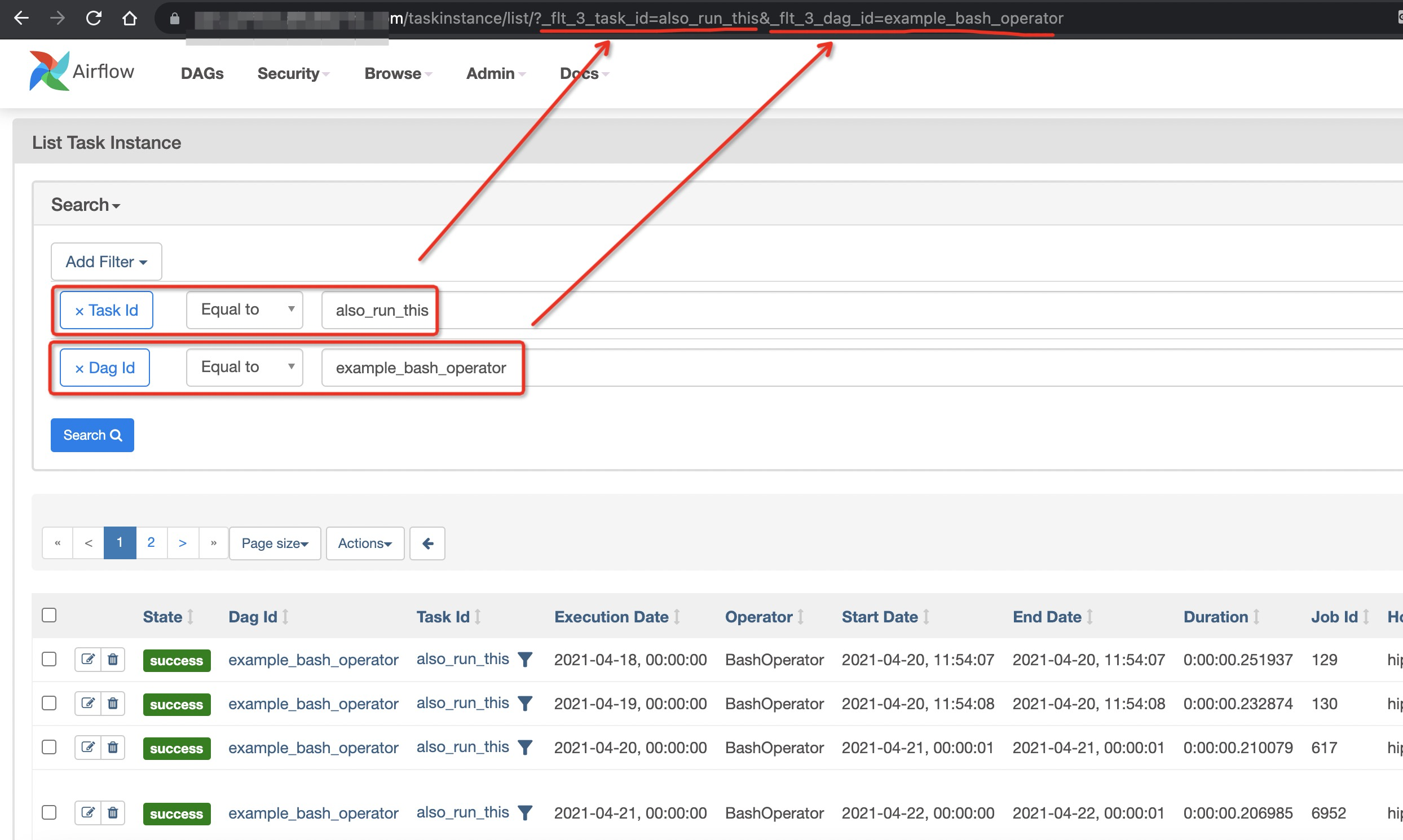 Make sure that after clicking the All Instances button in the Task Instance panel, the results will be filtered by dag_id and task_id. In the old version of airflow, such as 1.7, The naming rule for url parameters is: `fltX_fieldName_filterType`, such as: `flt1_dag_id_equals`.  But after airflow2.0, The naming rule becomes: Starts with: `_flt_0_fieldName` Ends with: `_flt_1_fieldName` Contains: `_flt_2_fieldName` Equal to: `_flt_3_fieldName` Not Starts with: `_flt_4_fieldName` Not Ends with: `_flt_5_fieldName` Not Contains: `_flt_6_fieldName` Not Equal to: `_flt_7_fieldName`  So when need to filter dag_id, the filter parameter should be: `_flt_3_dag_id` <!-- Thank you for contributing! Please make sure that your code changes are covered with tests. And in case of new features or big changes remember to adjust the documentation. Feel free to ping committers for the review! In case of existing issue, reference it using one of the following: closes: #ISSUE related: #ISSUE How to write a good git commit message: http://chris.beams.io/posts/git-commit/ --> --- **^ Add meaningful description above** Read the **[Pull Request Guidelines](https://github.com/apache/airflow/blob/main/CONTRIBUTING.rst#pull-request-guidelines)** for more information. In case of fundamental code change, Airflow Improvement Proposal ([AIP](https://cwiki.apache.org/confluence/display/AIRFLOW/Airflow+Improvements+Proposals)) is needed. In case of a new dependency, check compliance with the [ASF 3rd Party License Policy](https://www.apache.org/legal/resolved.html#category-x). In case of backwards incompatible changes please leave a note in [UPDATING.md](https://github.com/apache/airflow/blob/main/UPDATING.md). -- This is an automated message from the Apache Git Service. To respond to the message, please log on to GitHub and use the URL above to go to the specific comment. To unsubscribe, e-mail: [email protected] For queries about this service, please contact Infrastructure at: [email protected]