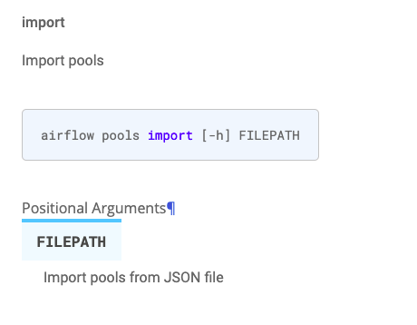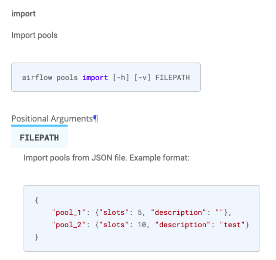 Had to dive into the source code to understand what format is expected for `airflow pools import`. This PR adds an example JSON to the docs. ### **Before:**  ### **After:**  <!-- Thank you for contributing! Please make sure that your code changes are covered with tests. And in case of new features or big changes remember to adjust the documentation. Feel free to ping committers for the review! In case of existing issue, reference it using one of the following: closes: #ISSUE related: #ISSUE How to write a good git commit message: http://chris.beams.io/posts/git-commit/ --> --- **^ Add meaningful description above** Read the **[Pull Request Guidelines](https://github.com/apache/airflow/blob/main/CONTRIBUTING.rst#pull-request-guidelines)** for more information. In case of fundamental code change, Airflow Improvement Proposal ([AIP](https://cwiki.apache.org/confluence/display/AIRFLOW/Airflow+Improvements+Proposals)) is needed. In case of a new dependency, check compliance with the [ASF 3rd Party License Policy](https://www.apache.org/legal/resolved.html#category-x). In case of backwards incompatible changes please leave a note in [UPDATING.md](https://github.com/apache/airflow/blob/main/UPDATING.md). -- This is an automated message from the Apache Git Service. To respond to the message, please log on to GitHub and use the URL above to go to the specific comment. To unsubscribe, e-mail: [email protected] For queries about this service, please contact Infrastructure at: [email protected]
