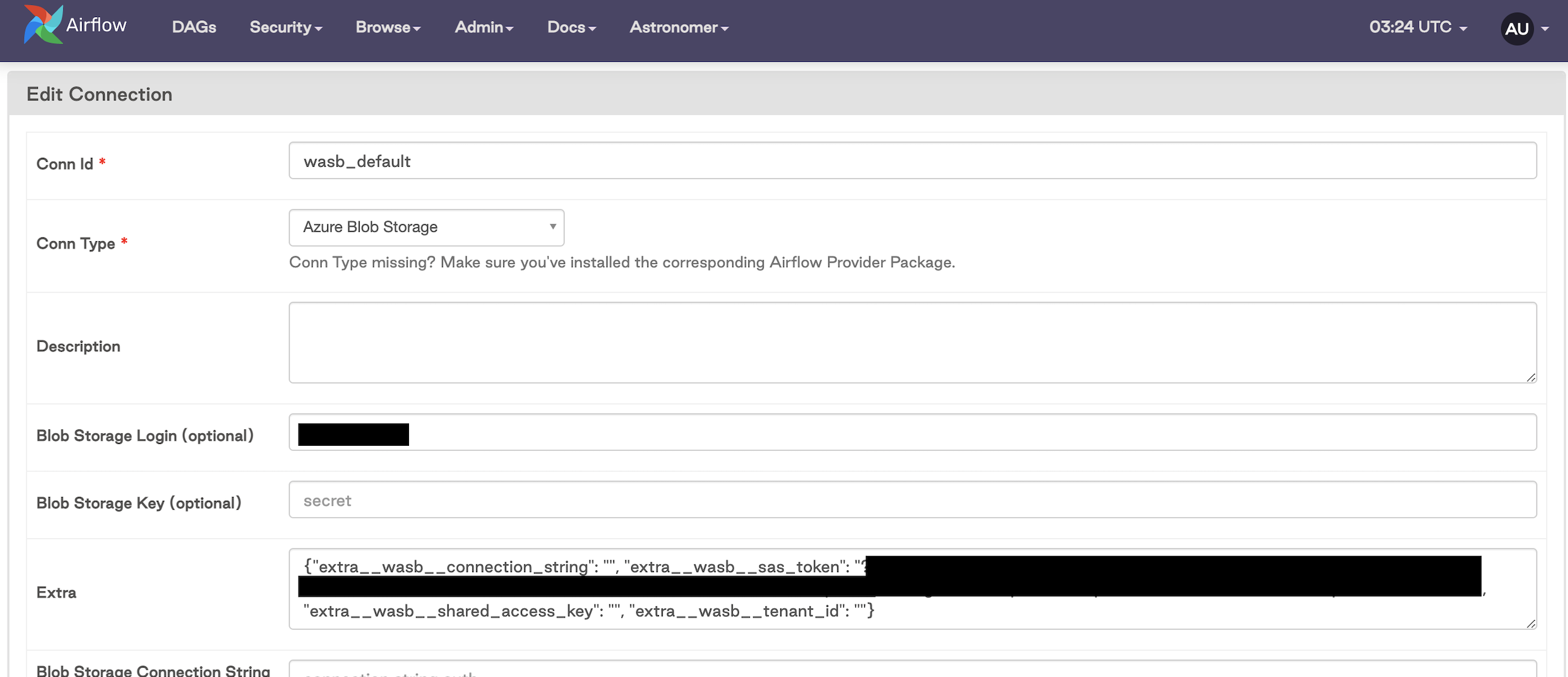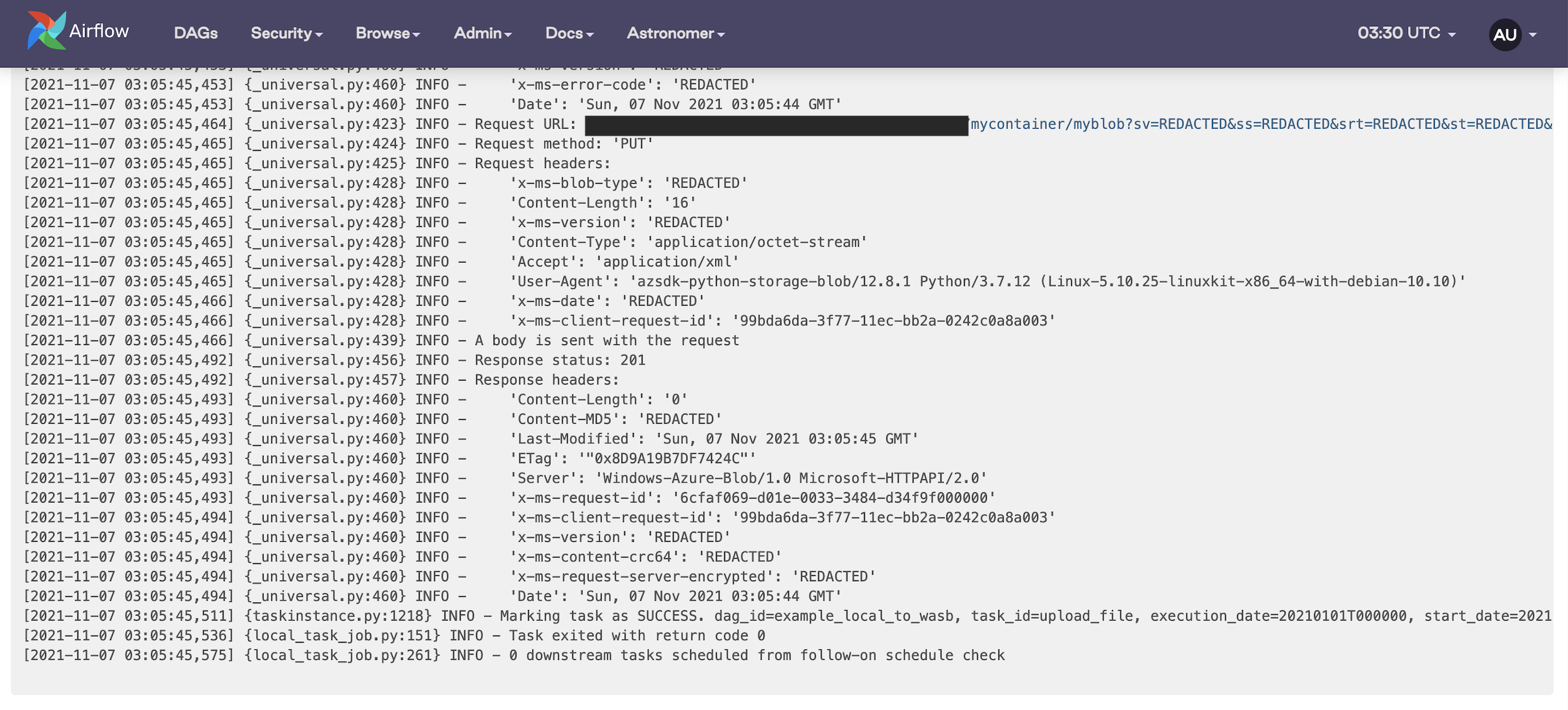 Hmm I wasn't sure off the top of my head but I dug into to the SDK a little. From what I can gather, if `ContainerClient. create_container()` [fails to create a container](https://github.com/Azure/azure-sdk-for-python/blob/73d0b36cf9c5ded2c5a642a48e9cf879f06455b5/sdk/storage/azure-storage-blob/azure/storage/blob/_container_client.py#L291-L299) (assuming metadata retrieval is OK) the original exception set is `HttpResponseError`. Then there is a [method](https://github.com/Azure/azure-sdk-for-python/blob/73d0b36cf9c5ded2c5a642a48e9cf879f06455b5/sdk/storage/azure-storage-blob/azure/storage/blob/_shared/response_handlers.py#L86) which looks at the error response and tries to raise a more specific error based on the response headers. There is a long set of errors that are checked but if the error code pulled from the headers doesn't match this exhaustive, the `HttpResponseError` is used when raising the exception. With that said though, I'm unable to reproduce the issue with the steps outlined with version 3.2.0 and 3.3.0 of the Azure provider. @zockette Are there other details you could add to help reproduce the error? **Connection**  **DAG** ```python from datetime import datetime from airflow.decorators import dag from airflow.providers.microsoft.azure.transfers.local_to_wasb import LocalFilesystemToWasbOperator from datetime import datetime from airflow.decorators import dag from airflow.providers.microsoft.azure.transfers.local_to_wasb import LocalFilesystemToWasbOperator @dag( dag_id="example_local_to_wasb", schedule_interval="@once", start_date=datetime(2021, 1, 1), catchup=False, default_args={"container_name": "mycontainer", "blob_name": "myblob"}, ) def local_to_wasb(): upload = LocalFilesystemToWasbOperator( task_id="upload_file", container_name="mycontainer", blob_name="myblob", file_path="include/example-text.txt", load_options={"overwrite": True}, ) dag = local_to_wasb() ``` **DAG Run Log**  -- This is an automated message from the Apache Git Service. To respond to the message, please log on to GitHub and use the URL above to go to the specific comment. To unsubscribe, e-mail: [email protected] For queries about this service, please contact Infrastructure at: [email protected]