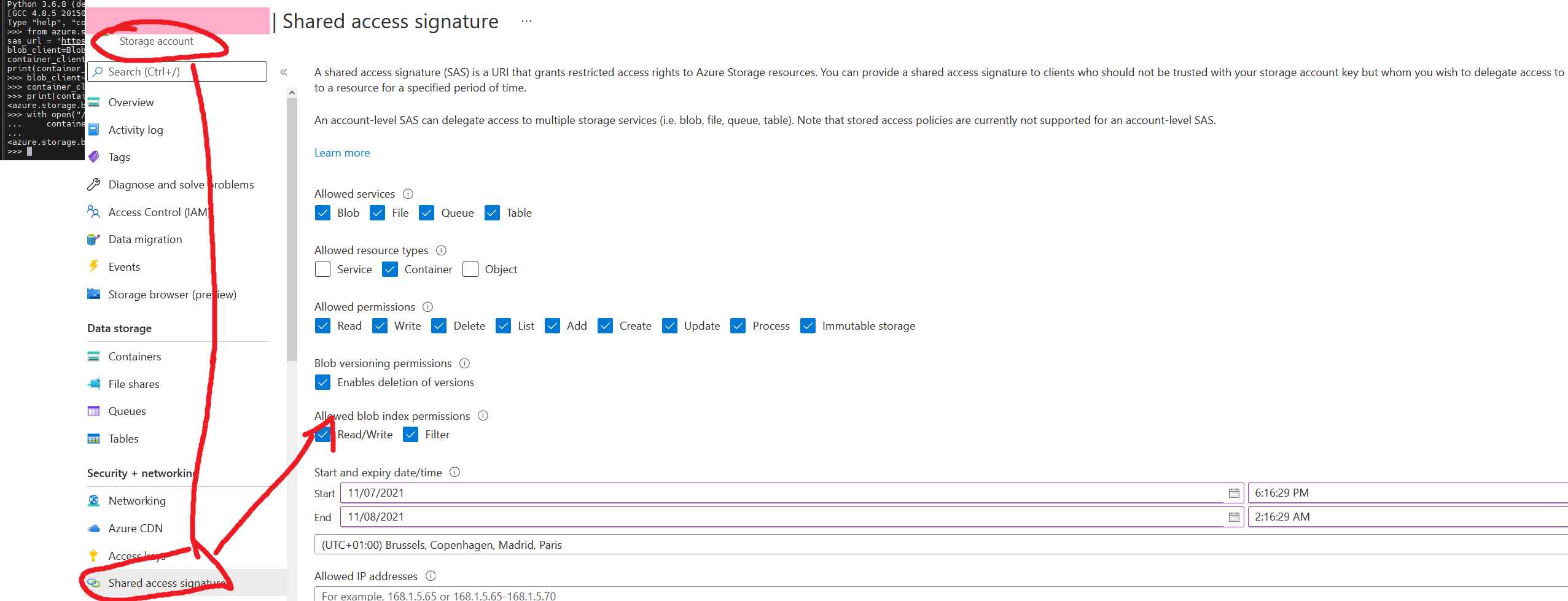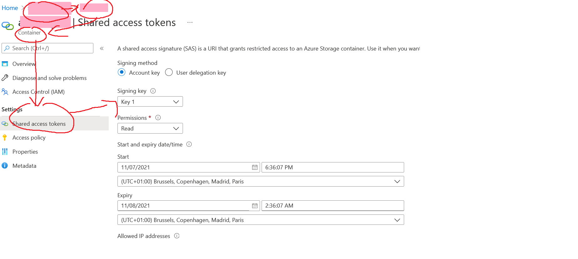 For reference, a Storage level SAS token would come from:  A Container level SAS token is made via the Container UI:  Hope you like my mspaint skills 😎 -- This is an automated message from the Apache Git Service. To respond to the message, please log on to GitHub and use the URL above to go to the specific comment. To unsubscribe, e-mail: [email protected] For queries about this service, please contact Infrastructure at: [email protected]