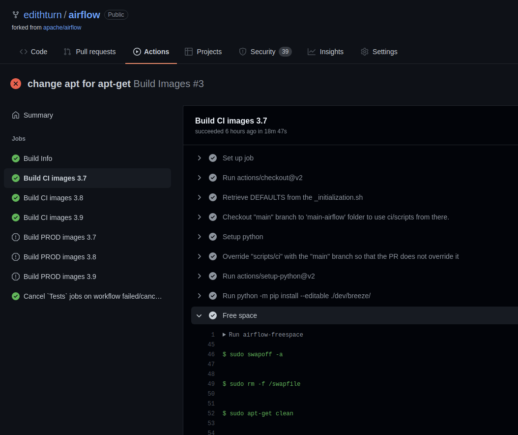 @potiuk they are working: airflow-freespace in **test** and **build images** workflows are working on my repo (main branch). These workflows failed in another step. test: https://github.com/edithturn/airflow/runs/4819773023?check_suite_focus=true build image: https://github.com/edithturn/airflow/runs/4820082842?check_suite_focus=true  Let me know your thoughts! 😃 -- This is an automated message from the Apache Git Service. To respond to the message, please log on to GitHub and use the URL above to go to the specific comment. To unsubscribe, e-mail: [email protected] For queries about this service, please contact Infrastructure at: [email protected]