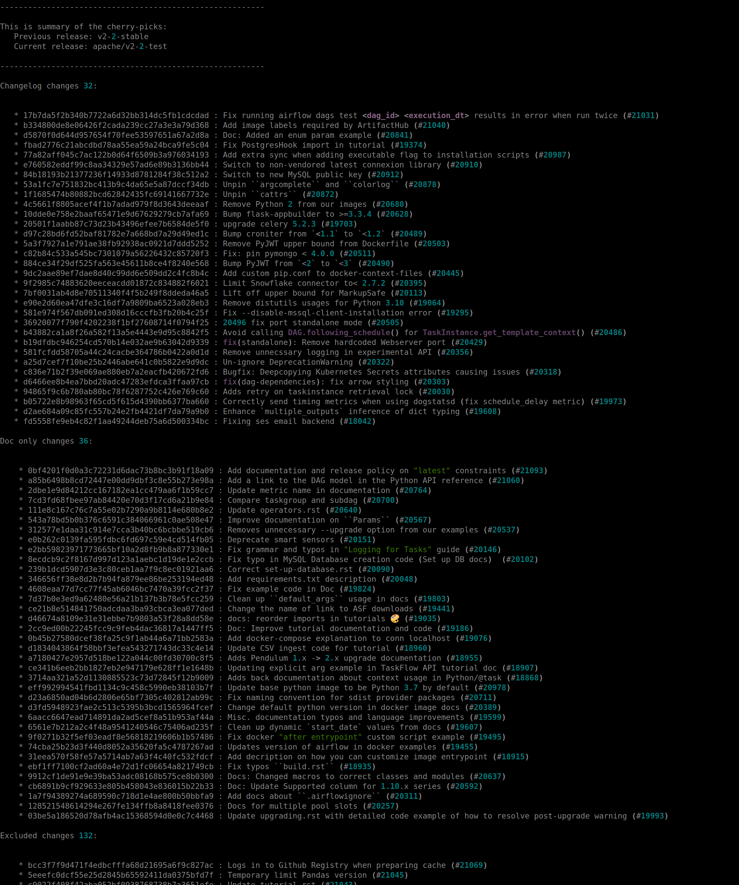 And the latest version contains also the really nice summary of the changes and a recipe how you can check if the "doc-only" and "excluded" changes do not contain anything "sneaky":  -- This is an automated message from the Apache Git Service. To respond to the message, please log on to GitHub and use the URL above to go to the specific comment. To unsubscribe, e-mail: [email protected] For queries about this service, please contact Infrastructure at: [email protected]