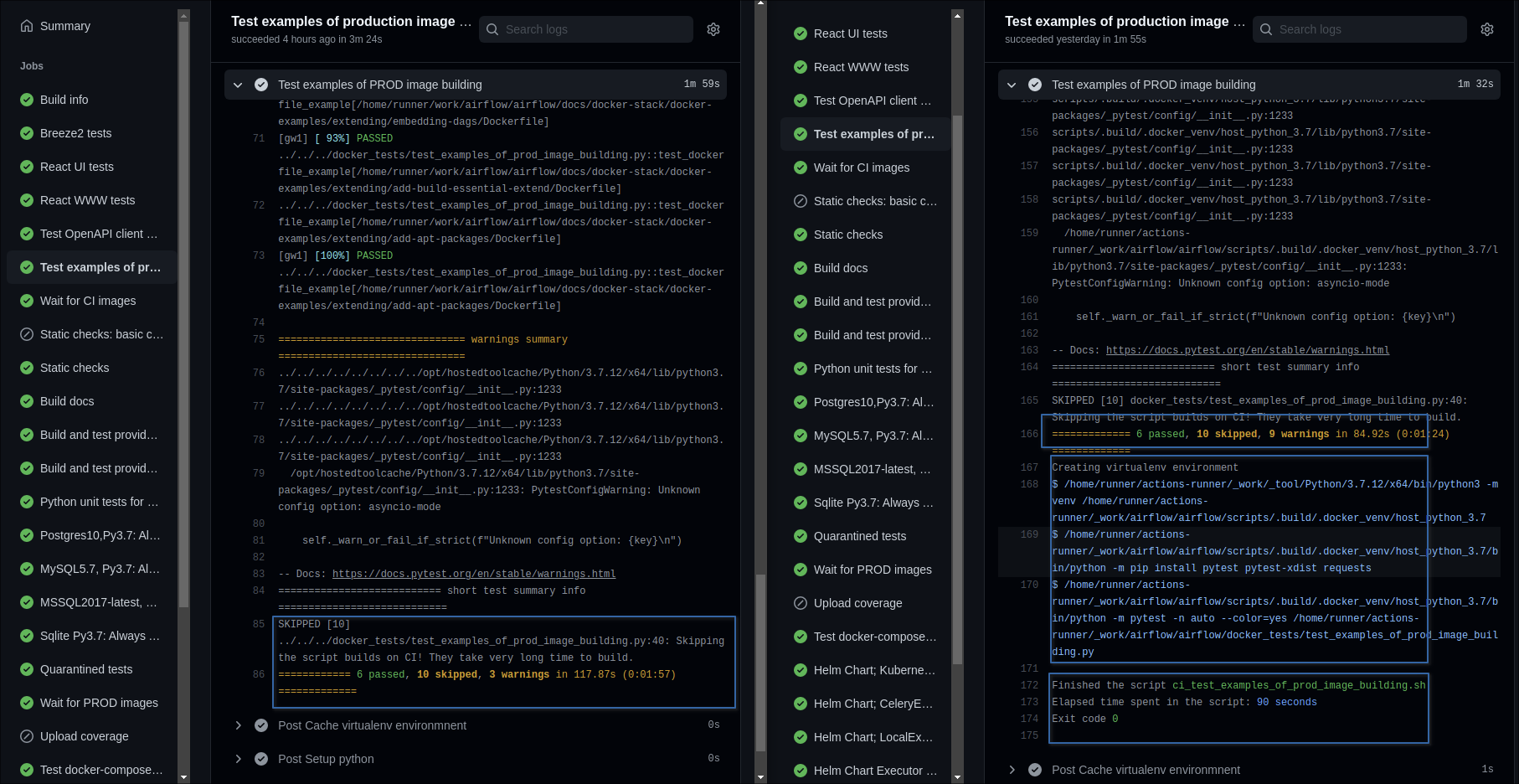 @potiuk I tested, my mistake was that I was calling to this path **tests** in the w**orking-directory** since there is where **conftest.py** file is. But the code of test_examples_of_prod_image_building.py says exactly where the tests are running, it is in **docker-examples**. I also compare the output of my PR (left) and the previous code(right) https://github.com/apache/airflow/actions/runs/1748452248 * It is executing all the tests (passed and skipped are the same quantity). Except for **Warnings** are not the same, I don't think they need to give us the same amount always. * Another difference is "creating a virtual environment" which is part of the code ci_run_docker_tests.sh, which we don't need it  -- This is an automated message from the Apache Git Service. To respond to the message, please log on to GitHub and use the URL above to go to the specific comment. To unsubscribe, e-mail: [email protected] For queries about this service, please contact Infrastructure at: [email protected]