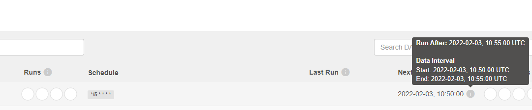 ### Apache Airflow version 2.2.3 (latest released) ### What happened I have tried to schedule a dag to run every 5 mins. However at time 10:57am the dag looks like the below and I would have assumed the dag should have been triggered.  And then at 11:02 am I can see the the next run information has changed but the dag still hasn't run  This is the code used to create the dag ``` with DAG("my_dag",start_date=datetime(2021, 1 ,1),schedule_interval= '*/5 * * * *', catchup = False) as dag:` task1 = BashOperator(task_id = 'test', bash_command = 'echo "hello"') ``` ### What you expected to happen I expect the dag to run or at least log errors in the scheduler logs ### How to reproduce Create a new dag with a scheduling interval which isn't none ### Operating System Amazon Linux 2 ### Versions of Apache Airflow Providers _No response_ ### Deployment Virtualenv installation ### Deployment details _No response_ ### Anything else Using MySQL 8.0.23. ### Are you willing to submit PR? - [ ] Yes I am willing to submit a PR! ### Code of Conduct - [X] I agree to follow this project's [Code of Conduct](https://github.com/apache/airflow/blob/main/CODE_OF_CONDUCT.md) -- This is an automated message from the Apache Git Service. To respond to the message, please log on to GitHub and use the URL above to go to the specific comment. To unsubscribe, e-mail: [email protected] For queries about this service, please contact Infrastructure at: [email protected]