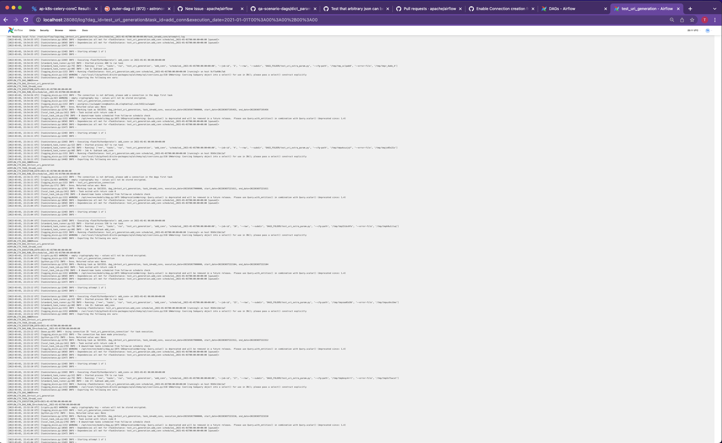 ### Apache Airflow version main (development) ### What happened When using the python operator on scheduled runs the task logs are repeating multiple times. This issue doesn't occur when using the web UI to trigger the dags  ### What you expected to happen I expected the task details for each task to show only one print out of that tasks logs ### How to reproduce ``` from airflow.models import DAG from airflow.operators.python import PythonOperator from datetime import datetime, timedelta dag_name = "test_uri_generation" def dummy_check4bugs(): pass with DAG( dag_id=dag_name, start_date=datetime(2021,1, 1), schedule_interval=timedelta(days=30, hours=12), ) as dag: t0 = PythonOperator( task_id="add_conn", #python_callable=add_conn, python_callable=dummy_check4bugs, ) t1 = PythonOperator( task_id="check_uri_generation", #python_callable=check_uri_gen, python_callable=dummy_check4bugs, ) t0 >> t1 ``` ### Operating System Docker ### Versions of Apache Airflow Providers _No response_ ### Deployment Docker-Compose ### Deployment details Airflow Breeze ### Anything else This bug occurs every time though only on scheduled runs and the first dag that runs typically repeats the logs the most. ### Are you willing to submit PR? - [ ] Yes I am willing to submit a PR! ### Code of Conduct - [X] I agree to follow this project's [Code of Conduct](https://github.com/apache/airflow/blob/main/CODE_OF_CONDUCT.md) -- This is an automated message from the Apache Git Service. To respond to the message, please log on to GitHub and use the URL above to go to the specific comment. To unsubscribe, e-mail: [email protected] For queries about this service, please contact Infrastructure at: [email protected]
