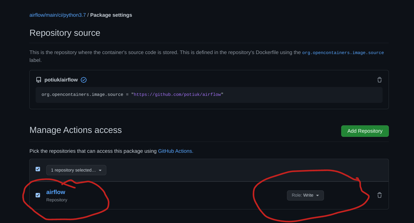 This is really cool and almost works :) Few things: 1) rebase please :) 2) please take a look at all the options and corresponding variables and update all the options to use the variables from the original `breeze`: you will see all the --flags and corresponding variables here: https://github.com/apache/airflow/blob/8c63a8d3cdc6c6d3911a8e7bde63f4fae1dde67c/breeze#L866 3) I think what you miss currently, is to make package 3.7 publicly available - you need to make sure that the package has the right access: * It has to be public * It has to have "airflow" repository with "write" access for Github actions Some screenshots from my https://github.com/users/potiuk/packages/container/airflow%2Fmain%2Fci%2Fpython3.7/settings Actions write access:  The package has to be public. Originally it is private but you can change visibility and once you do it, it should look like this:  -- This is an automated message from the Apache Git Service. To respond to the message, please log on to GitHub and use the URL above to go to the specific comment. To unsubscribe, e-mail: [email protected] For queries about this service, please contact Infrastructure at: [email protected]