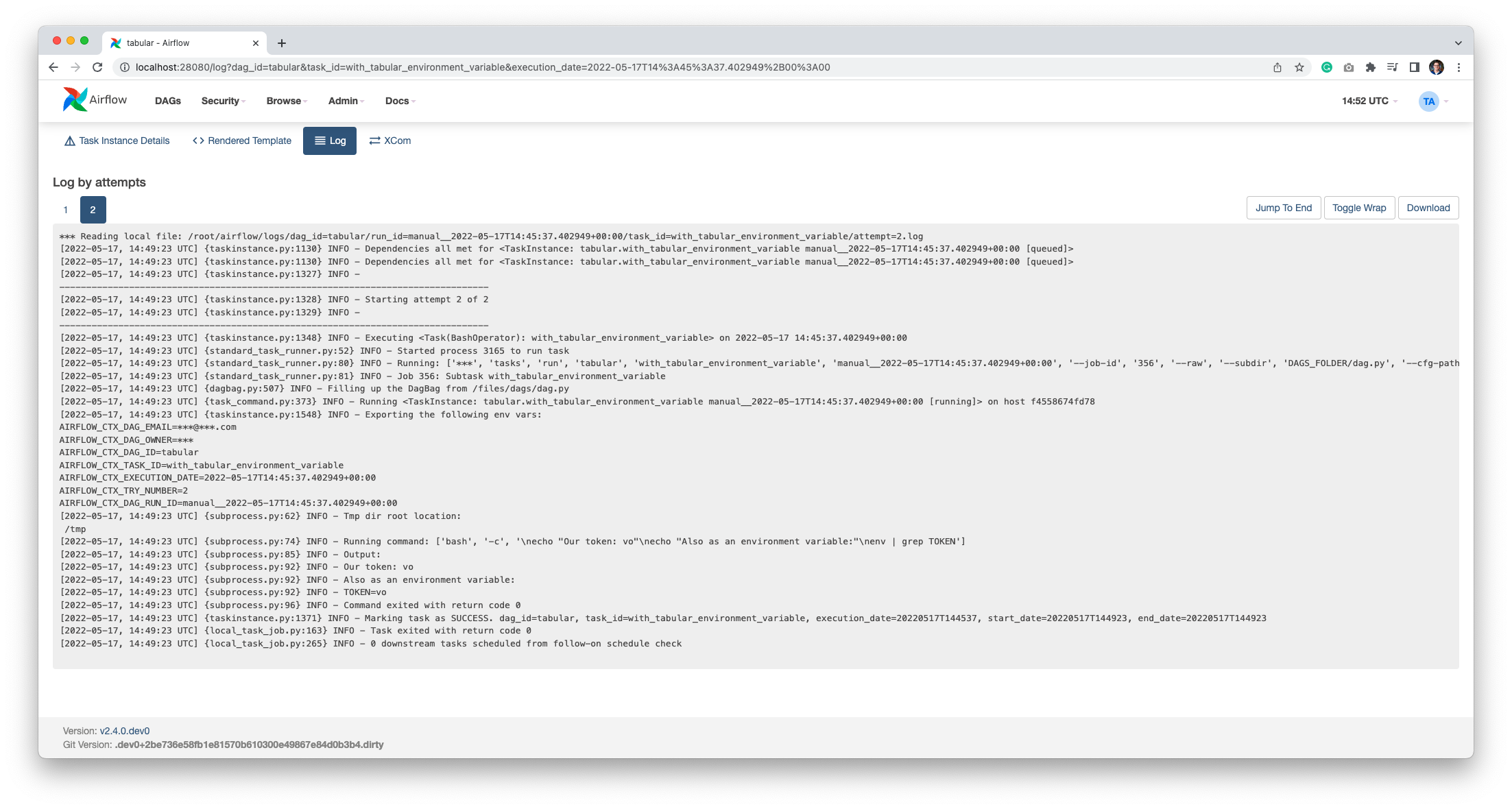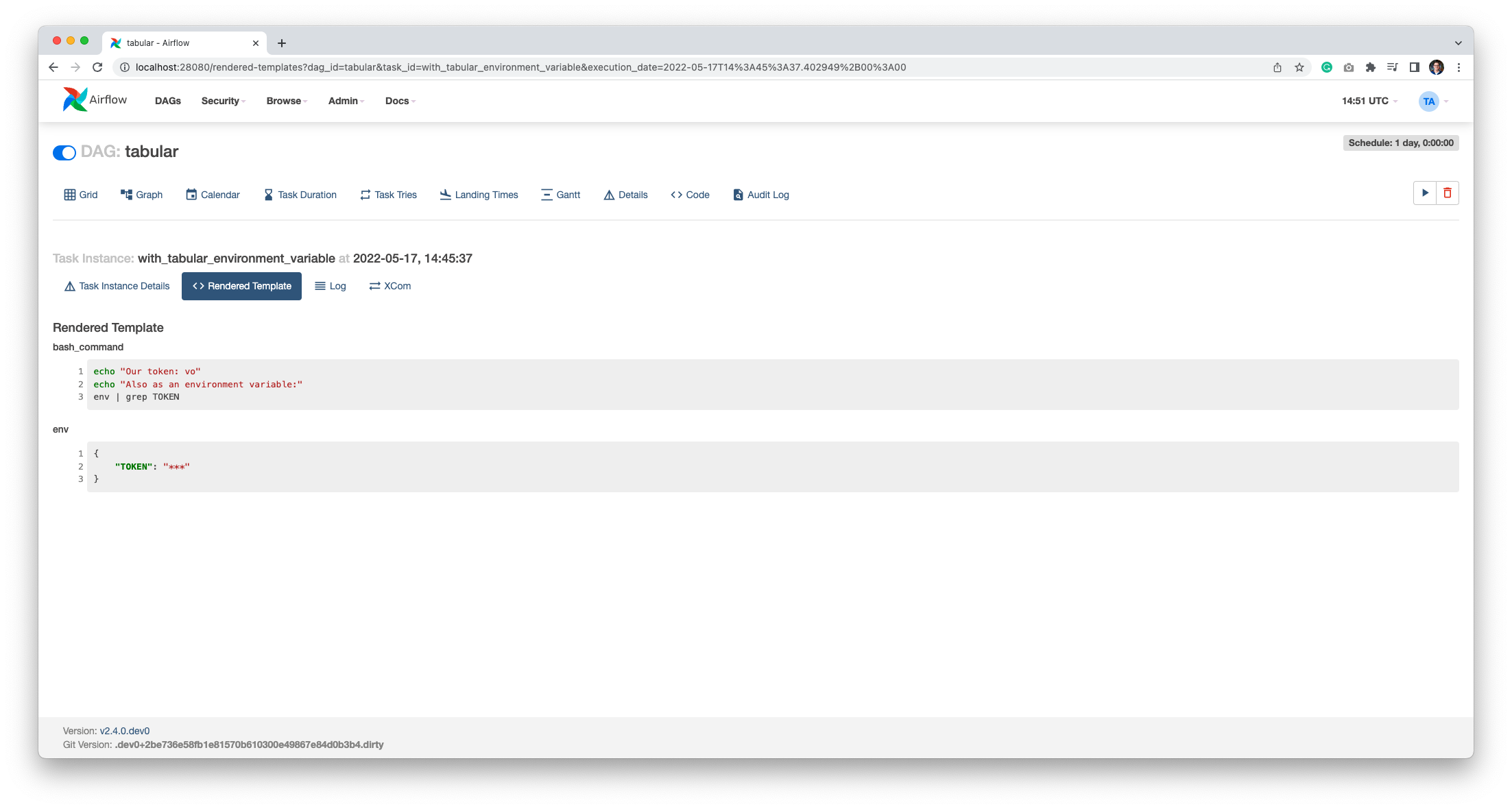 ########## airflow/providers/tabular/example_dags/example_tabular.py: ########## @@ -0,0 +1,39 @@ +# Licensed to the Apache Software Foundation (ASF) under one +# or more contributor license agreements. See the NOTICE file +# distributed with this work for additional information +# regarding copyright ownership. The ASF licenses this file +# to you under the Apache License, Version 2.0 (the +# "License"); you may not use this file except in compliance +# with the License. You may obtain a copy of the License at +# +# http://www.apache.org/licenses/LICENSE-2.0 +# +# Unless required by applicable law or agreed to in writing, +# software distributed under the License is distributed on an +# "AS IS" BASIS, WITHOUT WARRANTIES OR CONDITIONS OF ANY +# KIND, either express or implied. See the License for the +# specific language governing permissions and limitations +# under the License. + +from datetime import timedelta + +from airflow import DAG +from airflow.operators.bash import BashOperator +from airflow.providers.tabular.hooks.tabular import TabularHook + +default_args = { + "owner": "airflow", + "depends_on_past": False, + "email": ["[email protected]"], + "email_on_failure": False, + "email_on_retry": False, +} + +dag = DAG("tabular", default_args=default_args, schedule_interval=timedelta(1)) + +t1 = BashOperator( + task_id="templated", + bash_command="env", + env={"TOKEN": TabularHook().get_token()}, Review Comment: Thanks @eladkal for the suggestion. I've changed the code to make use of the connection macro. I'm not seeing the actual token in the TI details:  I do see it in the Rendered template:  But templating it inside of bash isn't the way to do it. It will be passed using an environment variable, which is nicely obfuscated. Also, I'm seeing the token because I'm explicitly echoing it:  It probably will be plugged into the `env_vars` of the SparkSubmit or SparkSQL operator: https://airflow.apache.org/docs/apache-airflow-providers-apache-spark/stable/_api/airflow/providers/apache/spark/operators/spark_submit/index.html -- This is an automated message from the Apache Git Service. To respond to the message, please log on to GitHub and use the URL above to go to the specific comment. To unsubscribe, e-mail: [email protected] For queries about this service, please contact Infrastructure at: [email protected]