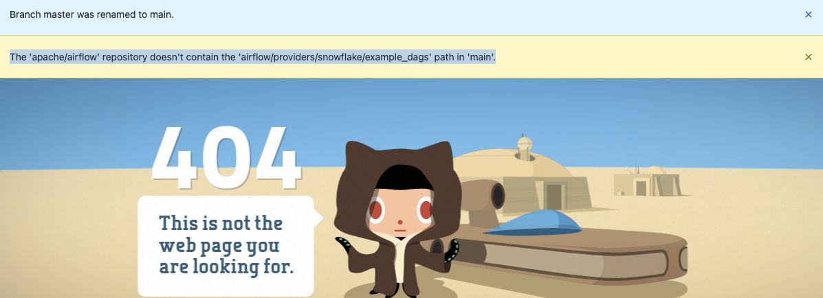 ### What do you see as an issue? When navigating to the [example DAG](https://github.com/apache/airflow/tree/main/airflow/providers/snowflake/example_dags) hyperlink provided in the [Airflow API documentation](https://airflow.apache.org/docs/apache-airflow-providers-snowflake/1.3.0/connections/snowflake.html), we land at this error  ### Solving the problem Replace the link in the doc : https://github.com/apache/airflow/tree/main/airflow/providers/snowflake/example_dags with the new working one. ### Anything else _No response_ ### Are you willing to submit PR? - [X] Yes I am willing to submit a PR! ### Code of Conduct - [X] I agree to follow this project's [Code of Conduct](https://github.com/apache/airflow/blob/main/CODE_OF_CONDUCT.md) -- This is an automated message from the Apache Git Service. To respond to the message, please log on to GitHub and use the URL above to go to the specific comment. To unsubscribe, e-mail: [email protected] For queries about this service, please contact Infrastructure at: [email protected]