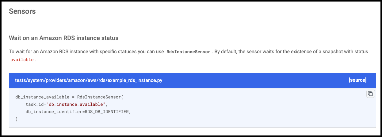 ########## docs/apache-airflow-providers-amazon/operators/rds.rst: ########## @@ -169,6 +169,22 @@ To delete a AWS DB instance you can use Sensors ------- +.. _howto/sensor:RdsInstanceSensor: + +Wait on an Amazon RDS instance status +===================================== + +To wait for an Amazon RDS instance with specific statuses you can use +:class:`~airflow.providers.amazon.aws.sensors.rds.RdsInstanceSensor`. +By default, the sensor waits for the existence of a snapshot with status ``available``. + +.. exampleinclude:: /../../tests/system/providers/amazon/aws/rds/example_rds_instance.py + :language: python + :dedent: 4 + :start-after: [START howto_sensor_rds_instance] + :end-before: [END howto_sensor_rds_instance] + Review Comment:  -- This is an automated message from the Apache Git Service. To respond to the message, please log on to GitHub and use the URL above to go to the specific comment. To unsubscribe, e-mail: [email protected] For queries about this service, please contact Infrastructure at: [email protected]